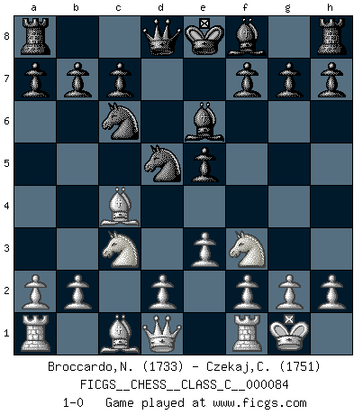 Last move : 1-0 2008 July 26 16:24:50 [Event "FICGS__CHESS__CLASS_C__000084"] [Site "FICGS"] [Date "2008.06.12"] [Round "1"] [White "Broccardo,Nicola"] [Black "Czekaj,Christophe"] [Result "1-0"] [WhiteElo "1733"] [BlackElo "1751"] 1.c4 e5 2.Nc3 Nf6 3.e3 d5 4.cxd5 Nxd5 5.Nf3 Nc6 6.Bc4 Be6 7.O-O 1-0 This chess game has been lost on time (started : 2008.06.12 13:7:56) English Opening Kingside Castling by player White (move 7) Player White won this chess game. Follow this game move after move (download)I'm not afraid of Spassky. The world knows I'm the best. You don't need a match to prove it. (Bobby Fischer) Sicherlich können nur Meister einen Stil haben. Daß ein nicht-Meister auch nur ein einziges Mal in seinem Leben eine Partie folgerecht durchführte, habe ich niemals bemerkt. (Emanuel Lasker) Los problemas de Ajedrez exigen del compositor las mismas virtudes que caracterizan todo el arte de valor: originalidad, invención, concisión, armonía, complejidad e insinceridad explendida. (Vladimir Nabokov) On est toujours la mazette de quelqu'un d'autre. (Anonyme) Wipe them out. All of them. (Darth Sidious in Star Wars ep.1)