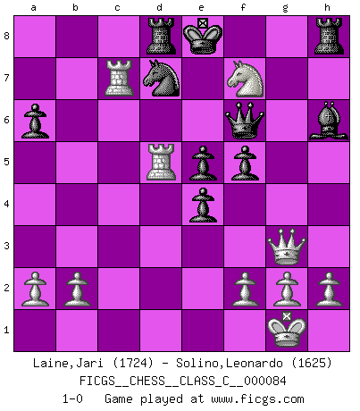 Last move : 1-0 2009 January 26 7:47:36 [Event "FICGS__CHESS__CLASS_C__000084"] [Site "FICGS"] [Date "2008.06.12"] [Round "1"] [White "Laine,Jari"] [Black "Solino,Leonardo"] [Result "1-0"] [WhiteElo "1724"] [BlackElo "1625"] 1.e4 c5 2.c3 Nf6 3.e5 Nd5 4.d4 cxd4 5.cxd4 d6 6.Bc4 Nb6 7.Bb5+ Nc6 8.d5 a6 9.Bxc6+ bxc6 10.dxc6 dxe5 11.Qh5 Qc7 12.Nf3 e4 13.Ng5 g6 14.Qh4 Qxc6 15.Nc3 f5 16.O-O h6 17.Nh3 e5 18.Rd1 Bb7 19.Qg3 Qe6 20.Be3 Nd7 21.Rac1 g5 22.Bxg5 hxg5 23.Nxg5 Qf6 24.Nd5 Bxd5 25.Rxd5 Rd8 26.Rc7 Bh6 27.Nf7 1-0 This chess game has been lost on time (started : 2008.06.12 13:7:56) Sicilian : Alapin's variation (2.c3) Kingside Castling by player White (move 16) Player White won this chess game. Follow this game move after move (download)Before the endgame, the Gods have placed the middle game. (Siegbert Tarrasch) Die starken Figuren des Gegners muss man abtauschen. (José Raúl Capablanca) Fischer no está bajo la obligación de nadie. (Joseph Platz) Les pièces de l'échiquier étaient impitoyables. Elles le retenaient, elles l'absorbaient. Il y avait de l'horreur en cela, mais aussi une harmonie unique. Car, qu'y a-t-il dans le monde, à part les échecs ? (V. Nabokov) Excelling at chess has long been considered a symbol of more general intelligence. That is an incorrect assumption in my view, as pleasant as it might be. But for the purposes of argument and investigation, chess is, in Russkin-Gutman's words, 'an unparalleled laboratory, since both the learning process and the degree of ability obtained can be objectified and quantified, providing an excellent comparative framework on which to use rigorous analytical techniques.' (The Chess Master and the Computer, by Garry Kasparov - 2010)