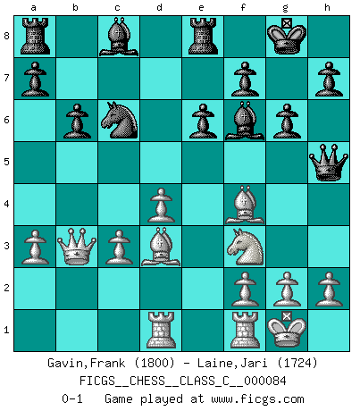 Last move : 0-1 2008 September 16 9:53:54 [Event "FICGS__CHESS__CLASS_C__000084"] [Site "FICGS"] [Date "2008.06.12"] [Round "1"] [White "Gavin,Frank"] [Black "Laine,Jari"] [Result "0-1"] [WhiteElo "1800"] [BlackElo "1724"] 1.e4 c6 2.c4 d5 3.exd5 cxd5 4.cxd5 Nf6 5.Nc3 Nxd5 6.Nf3 Nc6 7.d4 e6 8.Bd3 Bb4 9.Bd2 O-O 10.O-O Be7 11.a3 Bf6 12.Qc2 g6 13.Bh6 Re8 14.Rad1 Nxc3 15.bxc3 Qa5 16.Qb3 Qh5 17.Bf4 b6 0-1 Caro-Kann : Anti-anti-Caro-Kann defense Kingside Castling by player Black (move 9) Kingside Castling by player White (move 10) Player Black won this chess game. Follow this game move after move (download)I played Chess with him and would have beaten him sometimes only he always took back his last move, and ran the game out differently. (Mark Twain) Wenn Du einsam bist, wenn Du Dich in der Welt wie ein Fremder fühlst, spiele Schach. Das wird Deinen Geist erheben und Dein Ratgeber im Kampf sein. (Aristoteles) Hoy en día, si tu no eres un Gran Maestro a los 14 años, es mejor que lo olvides. (Anand Viswanathan) Le thème de l'attaque double intervient d'une manière ou d'une autre dans l'immense majorité des combinaisons. (Youri Averbakh) Macintosh - we might not get everything right, but at least we knew the century was going to end. (Douglas Adams)