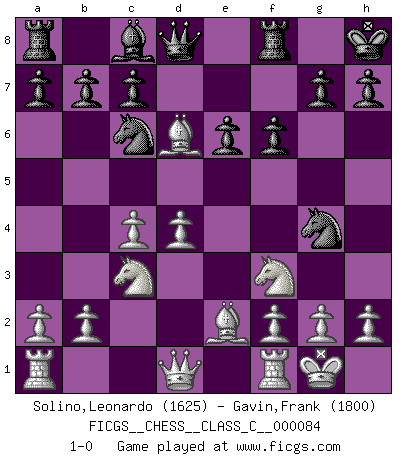 Last move : 1-0 2008 September 24 22:25:17 [Event "FICGS__CHESS__CLASS_C__000084"] [Site "FICGS"] [Date "2008.06.12"] [Round "1"] [White "Solino,Leonardo"] [Black "Gavin,Frank"] [Result "1-0"] [WhiteElo "1625"] [BlackElo "1800"] 1.d4 Nf6 2.c4 Nc6 3.Nf3 d6 4.Nc3 e6 5.e4 Be7 6.Be2 O-O 7.O-O Kh8 8.Bf4 Ng4 9.e5 f6 10.exd6 Bxd6 11.Bxd6 1-0 Kevitz-Trajkovich defense Kingside Castling by player Black (move 6) Kingside Castling by player White (move 7) Player White won this chess game. Follow this game move after move (download)Capture of the adverse King is the ultimate but not the first object of the game. (William Steinitz) Schach sollte überall auf der Welt Schulfach werden. Es fördert die geistige Auseinandersetzung. Es lehrt die Demut in der Niederlage. (Garry Kasparov) Cuando estes solo, cuando te sientas un extraño en el mundo, juega al Ajedrez. Esto levantará tu espiritu y será tu consejero de guerra. (Aristóteles) Un journaliste : 'Vous préférez avoir une dame de plus sur l'échiquier ou au lit ?' Boris Spassky : 'Ca dépend de la position.' All the biggest technological inventions created by man - the airplane, the automobile, the computer - says little about his intelligence, but speaks volumes about his laziness. (Mark Kennedy)