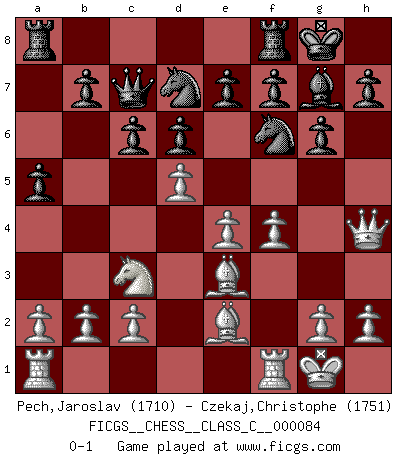 Last move : 0-1 2008 October 23 0:34:17 [Event "FICGS__CHESS__CLASS_C__000084"] [Site "FICGS"] [Date "2008.06.12"] [Round "1"] [White "Pech,Jaroslav"] [Black "Czekaj,Christophe"] [Result "0-1"] [WhiteElo "1710"] [BlackElo "1751"] 1.e4 g6 2.d4 d6 3.Nc3 Bg7 4.Nf3 Nf6 5.Be2 O-O 6.O-O Bg4 7.Be3 Nc6 8.d5 Bxf3 9.Bxf3 Ne5 10.Be2 a5 11.f4 Ned7 12.Qe1 c6 13.Qh4 Qc7 0-1 This chess game has been lost on time (started : 2008.06.12 13:7:56) Robatsch (Modern) defense Kingside Castling by player Black (move 5) Kingside Castling by player White (move 6) Player Black won this chess game. Follow this game move after move (download)The game of Chess is not merely an idle amusement; several very valuable qualities of the mind are to be acquired and strengthened by it, so as to become habits ready on all occasions; for life is a kind of Chess. (Benjamin Franklin) Ich habe Kasparov in Rente geschickt. (Veselin Topalov) El Jaque al descubierto es el bombardero del tablero. (Reuben Fine) Je ne crois pas en la psychologie, je crois aux bons coups. (Robert Fischer) To be champion requires more than simply being a strong player; one has to be a strong human being as well. (Anatoly Karpov)