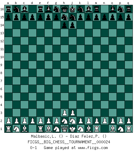 Last move : 0-1 2008 June 24 23:14:53 [Event "FICGS__BIG_CHESS__TOURNAMENT__000024"] [Site "FICGS"] [Date "2008.06.13"] [Round "1"] [White "Malbasic,Ljubisa"] [Black "Diaz Felez,Paco"] [Result "0-1"] [WhiteElo ""] [BlackElo ""] 0-1 Follow this game move after move (download)Chess is war over the board. The object is to crush the opponents mind. (Bobby Fischer) Ohne Leiden bildet sich kein Charakter. (Ernst Freiherr von Feuchtersleben) Bendita sea la memoria de aquel que dio al mundo este juego inmortal. (A. G. Gardiner) Il vaut mieux sacrifier les pièces de l'adversaire. (Xavier Tartacover) Follow your passion, and success will follow you. (Arthur Buddhold)
