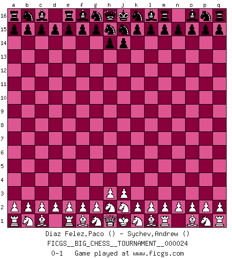 Last move : 0-1 2008 July 14 3:2:32 [Event "FICGS__BIG_CHESS__TOURNAMENT__000024"] [Site "FICGS"] [Date "2008.06.13"] [Round "1"] [White "Diaz Felez,Paco"] [Black "Sychev,Andrew"] [Result "0-1"] [WhiteElo ""] [BlackElo ""] 0-1 This big chess game has been lost on time (started : 2008.06.13 20:41:30) Follow this game move after move (download)We must make sure that Chess will not be like a dead language, very interesting, but for a very small group. (Sytze Faber) Je mehr wir mit Computern analysieren, desto mehr glauben wir an Verteidigung. (Vladimir Kramnik) Un entendimiento minucioso de las típicas continuaciones de mate hacen de las mas complicadas combinaciones de sacrificio que conducen hacia ellas no solo no dificiles, sino casi un asunto de rutina. (Siegbert Tarrasch) Soyez une menace à chaque fois que vous vous asseyez pour jouer. (Ken Smith) There are lots of people who mistake their imagination for their memory. (Josh Bilings)