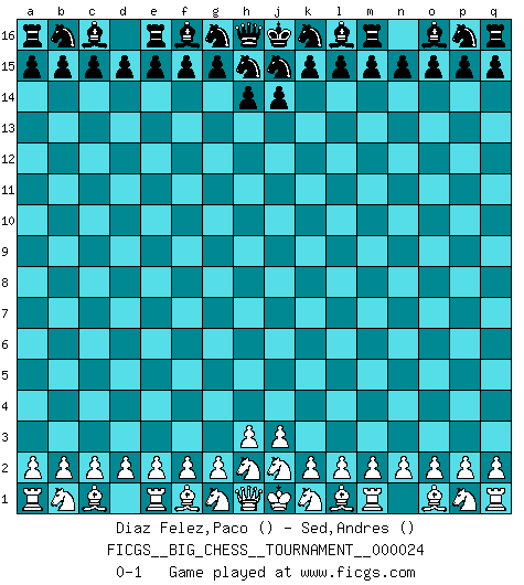 Last move : 0-1 2008 July 14 3:2:32 [Event "FICGS__BIG_CHESS__TOURNAMENT__000024"] [Site "FICGS"] [Date "2008.06.13"] [Round "1"] [White "Diaz Felez,Paco"] [Black "Sed,Andres"] [Result "0-1"] [WhiteElo ""] [BlackElo ""] 0-1 This big chess game has been lost on time (started : 2008.06.13 20:41:30) Follow this game move after move (download)We must make sure that Chess will not be like a dead language, very interesting, but for a very small group. (Sytze Faber) Der 70jährige Viktor Kortschnoi: Die Rentenanstalt wollte mich zwingen in Rente zu gehen. Meine Frau erhält jetzt eine Pension- und ich zahle weiter in die Rentenkasse ein! (Viktor Kortschnoi) ¿Se han dado cuenta de que Fischer casi nunca ha tenido piezas malas? El las intercambia y las piezas malas se quedan con sus oponenets. (Yuri Balashov) Les écrivains ont utilisé les échecs pour analyser les côtés extrêmes de la nature humaine. Dans ce cadre, les échecs offrent un champ d'expérimentation idéal. Mais on pourrait faire la même chose avec la peinture. Et là, en vous référant à Van Gogh, vous ne tirerez pas de conclusion définitive sur les peintres. (Gary Kasparov) Life is like internet, nothing interesting, but noone want to leave it. (Ilmars Cirulis)