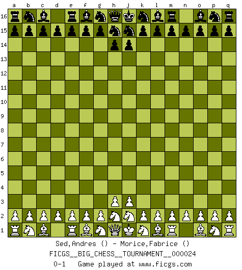 Last move : 0-1 2008 June 19 20:51:30 [Event "FICGS__BIG_CHESS__TOURNAMENT__000024"] [Site "FICGS"] [Date "2008.06.13"] [Round "1"] [White "Sed,Andres"] [Black "Morice,Fabrice"] [Result "0-1"] [WhiteElo ""] [BlackElo ""] 0-1 Follow this game move after move (download)Nowadays, when you're not a grandmaster at 14, you can forget about it. (Anand Viswanathan) Mein erstes Ziel war nicht, die Partie zu gewinnen, sondern eine Figur zu opfern. -- der junge (Wilhelm Steinitz) El ganar no lo es todo... pero el perder es nada. (Mednis) Ne tendez aucun piège pour le plaisir ! Ne jouez rien dans l'espoir que l'adversaire réagisse de façon stupide ! Prenez toujours pour acquis que l'adversaire va trouver le meilleur coup ! Ne jouez jamais de coup dans l'espoir que l'adversaire ne voie pas la menace ! Chacun de vos coups doit améliorer la position d'une façon ou d'une autre. It's not the will to win, but the will to prepare to win that makes the difference. (Bear Bryant)