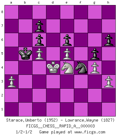 Last move : 1/2-1/2 2006 August 11 12:8:47 [Event "FICGS__CHESS__RAPID_A__000003"] [Site "FICGS"] [Date "2006.07.21"] [Round "1"] [White "Starace,Umberto"] [Black "Lowrance,Wayne"] [Result "1/2-1/2"] [WhiteElo "1952"] [BlackElo "1827"] 1.e4 e5 2.Nf3 Nc6 3.Bb5 Nf6 4.O-O Nxe4 5.d4 Nd6 6.Bxc6 dxc6 7.dxe5 Nf5 8.Qxd8+ Kxd8 9.Rd1+ Ke8 10.Nc3 a5 11.h3 Be6 12.Ng5 Be7 13.Nxe6 fxe6 14.Ne4 Rd8 15.Rxd8+ Kxd8 16.Bd2 b6 17.Kf1 Kc8 18.c3 Rd8 19.g4 Nh4 20.Ke2 Ng6 21.f4 Kb7 22.Be3 Rf8 23.Rf1 Bh4 24.b3 a4 25.b4 Kc8 26.a3 Kb8 27.c4 Kb7 28.Bd2 h6 29.Rf3 Be7 30.c5 bxc5 31.bxc5 Ka6 32.Rf1 Bh4 33.Be3 Ne7 34.Nc3 Bg3 35.Rf3 Bh2 36.Nxa4 Ng6 37.Nb2 Bxf4 38.Nd3 Bxe3 39.Rxf8 Nxf8 40.Kxe3 g5 41.Kd4 Kb5 42.Nf2 Ng6 43.Ne4 Nf4 1/2-1/2 Ruy Lopez : Berlin defense, Open variation Kingside Castling by player White (move 4) This chess game ended in a draw. Follow this game move after move (download)The mistakes are there, waiting to be made. (Savielly Tartakower) Sitze auf Deine Hände. (Siegbert Tarrasch) La esencia del Ajedrez es pensar acerca de lo que el Ajedrez es. (David Bronstein) La tactique, c'est ce que vous faites quand il y a quelque chose à faire; la stratégie, c'est ce que vous faites quand il n'y a rien à faire. (Savielli Tartacower) You can only get smarter by playing a smarter opponent. (Revolver, movie)
