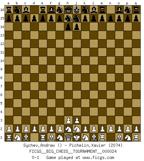 Last move : 0-1 2008 July 14 3:2:32 [Event "FICGS__BIG_CHESS__TOURNAMENT__000024"] [Site "FICGS"] [Date "2008.06.13"] [Round "1"] [White "Sychev,Andrew"] [Black "Pichelin,Xavier"] [Result "0-1"] [WhiteElo ""] [BlackElo "2074"] 0-1 This big chess game has been lost on time (started : 2008.06.13 20:41:30) Follow this game move after move (download)Pawn endings are to Chess what putting is to golf. (Cecil Purdy) Über Frauen: Chess is better. (Robert James Fischer) El muchacho (en ese entonces un niño de 12 años llamado Anatoly Karpov) no tiene ni idea de lo que es el Ajedrez y no hay futuro en absoluto para el en esta profesión. (Mikhail Botvinnik) Il (Jacob Murray) ne joue pas pour le bon coup, mais pour le meilleur. (Eloi Relange) If you don't practice you don't deserve to win. (Andre Agassi)