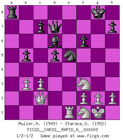 Last move : 1/2-1/2 2006 July 31 8:11:20 [Event "FICGS__CHESS__RAPID_A__000003"] [Site "FICGS"] [Date "2006.07.21"] [Round "1"] [White "Muller,Henri-Louis"] [Black "Starace,Umberto"] [Result "1/2-1/2"] [WhiteElo "1949"] [BlackElo "1952"] 1.e4 e5 2.Nf3 Nc6 3.Bb5 a6 4.Ba4 Nf6 5.O-O Nxe4 6.d4 b5 7.Bb3 d5 8.dxe5 Be6 9.c3 Be7 10.Be3 O-O 11.Nbd2 Qd7 12.Re1 f5 13.exf6 Nxf6 14.Bc2 Bf5 15.a4 Bd6 16.axb5 axb5 17.Rxa8 Rxa8 18.Bg5 Bxc2 19.Qxc2 Ne7 20.Bxf6 gxf6 21.Nf1 Ng6 22.b3 Ne5 1/2-1/2 Ruy Lopez : Open, 7.Bb3 Kingside Castling by player White (move 5) Kingside Castling by player Black (move 10) This chess game ended in a draw. Follow this game move after move (download)You must take your opponent into a deep dark forest where 2+2=5, and the path leading out is only wide enough for one. (Mikhail Tal) Im Blitz ist es einfacher mit einer Figur weniger anzugreifen, als sich mit einer Mehrfigur zu verteidigen. (Mikhail Nekhemyevich Tal) La caracteristica mas importante en la posición del Ajedrez es la actividad de las piezas. Esto es absolutamente fundamental en todas las fases del juego: Apertura, Juego Medio y especialmente Finales. La limitación primordial en la actividad de una pieza, es la estructuración de los Peones. (Michael Stean) Il n'y a pas de prix trop élevé au scalp de l'ennemi. (Koblentz) I'm extremely disappointed. I send you out for exciting, new designer drugs, you come back with tomato sauce. (Gregory House, House M.D.)