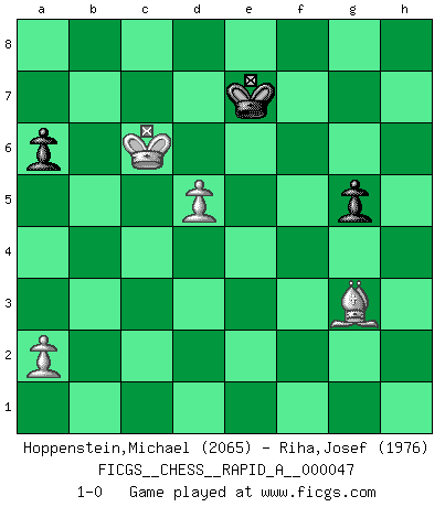 Last move : 1-0 2008 June 21 14:52:9 [Event "FICGS__CHESS__RAPID_A__000047"] [Site "FICGS"] [Date "2008.06.14"] [Round "1"] [White "Hoppenstein,Michael"] [Black "Riha,Josef"] [Result "1-0"] [WhiteElo "2065"] [BlackElo "1976"] 1.d4 d5 2.c4 dxc4 3.e3 e5 4.Bxc4 exd4 5.exd4 Bb4+ 6.Nc3 Nf6 7.Nf3 O-O 8.O-O Bg4 9.h3 Bh5 10.g4 Bg6 11.Qb3 Bxc3 12.bxc3 Nc6 13.Qxb7 Be4 14.Nd2 Na5 15.Qa6 Nxc4 16.Qxc4 Re8 17.Nxe4 Nxe4 18.Qd3 Qf6 19.f3 Ng3 20.Rf2 h5 21.Kg2 h4 22.Be3 Qd6 23.Qd2 Ne4 24.fxe4 Qg3+ 25.Kh1 Qxh3+ 26.Kg1 Rxe4 27.Bf4 Rae8 28.Rg2 c6 29.Rf1 R8e7 30.g5 R7e6 31.Be5 Rg6 32.Rf4 Rxf4 33.Qxf4 Qxc3 34.Kh2 Qe1 35.Qf5 Qe3 36.Qc8+ Kh7 37.Qg4 Kg8 38.Qxh4 f6 39.Qf4 Qxf4+ 40.Bxf4 fxg5 41.Rxg5 Rxg5 42.Bxg5 Kf7 43.Bd2 Ke6 44.Bb4 Kf6 45.Kg3 Kf5 46.Kf3 a6 47.Be1 g6 48.Ke3 Ke6 49.Ke4 Kd6 50.Bg3+ Ke6 51.d5+ Kd7 52.Kd4 g5 53.Kc5 Ke7 54.Kxc6 1-0 Queen's gambit accepted Kingside Castling by player Black (move 7) Kingside Castling by player White (move 8) 10 pieces endgame at move 41 : White KRBPP , Black KRPPP WHITE : King + 1 Rook 1 Bishop 2 Pawns BLACK : King + 1 Rook 3 Pawns 9 pieces endgame at move 41 : White KBPP , Black KRPPP WHITE : King + 1 Bishop 2 Pawns BLACK : King + 1 Rook 3 Pawns 8 pieces endgame at move 42 : White KBPP , Black KPPP WHITE : King + 1 Bishop 2 Pawns BLACK : King + 3 Pawns 7 pieces endgame at move 54 : White KBPP , Black KPP WHITE : King + 1 Bishop 2 Pawns BLACK : King + 2 Pawns Player White won this chess game. Follow this game move after move (download)A Chess game is divided into three stages: the first, when you hope you have the advantage, the second when you believe you have an advantage, and the third... when you know you're going to lose ! (Savielly Tartakower) Konzentriere dich auf materielle Gewinne. Nimm, was dir dein Gegner gibt, ausser es gibt einen guten Grund der dagegenspricht. (Robert James Fischer) Combinaciones deslumbrantes son para la mayoría, mover madera es para los pocos. (Georg Kieninger) Les échecs sont utiles à l'exercice de la faculté de penser et à celle de l'imagination. Car nous devons posséder une méthode élaborée pour atteindre des buts partout où nous devons conduire notre raison. (Leibnitz) The faster the computer, the slower the brain. (Thibault de Vassal)