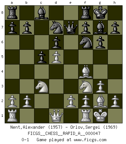 Last move : 0-1 2008 July 28 13:51:0 [Event "FICGS__CHESS__RAPID_A__000047"] [Site "FICGS"] [Date "2008.06.14"] [Round "1"] [White "Nent,Alexander"] [Black "Orlov,Vladimir"] [Result "0-1"] [WhiteElo "1957"] [BlackElo "1969"] 1.d4 Nf6 2.c4 e6 3.g3 c5 4.d5 exd5 5.cxd5 g6 6.Nc3 Bg7 7.Bg2 O-O 8.Nf3 d6 9.O-O Nbd7 10.Bf4 Qe7 0-1 Catalan Opening Kingside Castling by player Black (move 7) Kingside Castling by player White (move 9) Player Black won this chess game. Follow this game move after move (download)Good offense and good defense both begin with good development. (Bruce A. Moon) Die Neutralität betrachte ich als eine schwere Krankheit. (Viktor Kortschnoi) Un juego de Ajedrez es un dialogo, una conversación entre un jugador y su oponente. Cada movimiento del oponente puede contener amenazas o tropiezos, pero un jugador no se puede defender de las amenazas o tomar ventaja de los tropiezos si es que no se pregunta a sí mismo: ¿Que es lo que mi oponente va a hacer después de cada movida?. (Bruce A. Moon) On est toujours la mazette de quelqu'un d'autre. (Anonyme) No, no, you're not thinking; you're just being logical. (Niels Bohr)