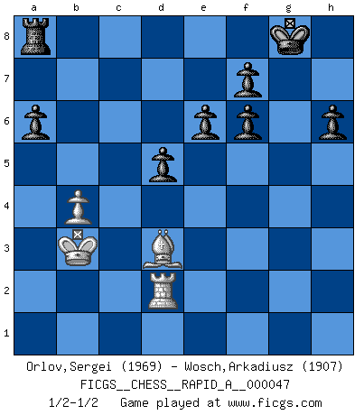 Last move : 1/2-1/2 2008 December 2 1:0:55 [Event "FICGS__CHESS__RAPID_A__000047"] [Site "FICGS"] [Date "2008.06.14"] [Round "1"] [White "Orlov,Vladimir"] [Black "Wosch,Arkadiusz"] [Result "1/2-1/2"] [WhiteElo "1969"] [BlackElo "1907"] 1.e4 c5 2.Nf3 Nc6 3.d4 cxd4 4.Nxd4 Nf6 5.Nc3 d6 6.Bg5 e6 7.Qd2 a6 8.O-O-O Bd7 9.f3 Be7 10.Kb1 Rc8 11.h4 b5 12.g4 Ne5 13.Qe1 Qc7 14.Bc1 b4 15.Nce2 Ba4 16.b3 Nxf3 17.Nxf3 Qxc2+ 18.Ka1 Bxb3 19.Rd2 Qxe4 20.axb3 Qxf3 21.Nd4 Qxg4 22.Bg2 d5 23.Bf3 Qf4 24.Rf1 Qd6 25.Bb2 O-O 26.h5 h6 27.Rg2 Kh8 28.Be2 Rc3 29.Bxc3 bxc3 30.Qxc3 Ne4 31.Qb2 Bf6 32.Bd3 Qb6 33.Rxf6 Nxf6 34.Nf3 Nxh5 35.Ne5 Kg8 36.Nd7 Qa5+ 37.Kb1 Rc8 38.Nf6+ Nxf6 39.Qxf6 Qe1+ 40.Ka2 Qd2+ 41.Rxd2 gxf6 42.b4 Ra8 43.Kb3 1/2-1/2 Sicilian defense Queenside Castling by player White (move 8) Kingside Castling by player Black (move 25) This chess game ended in a draw. Follow this game move after move (download)I believe that Chess possesses a magic that is also a help in advanced age. A rheumatic knee is forgotten during a game of Chess and other events can seem quite unimportant in comparison with a catastrophe on the chessboard. (Vlastimil Hort) Je mehr wir mit Computern analysieren, desto mehr glauben wir an Verteidigung. (Vladimir Kramnik) El muchacho (en ese entonces un niño de 12 años llamado Anatoly Karpov) no tiene ni idea de lo que es el Ajedrez y no hay futuro en absoluto para el en esta profesión. (Mikhail Botvinnik) C'est la seule position que je connaisse où les deux camps sont mals. Propos prêtés à V. Anand. Depression is just anger without enthusiasm. (Unknown)