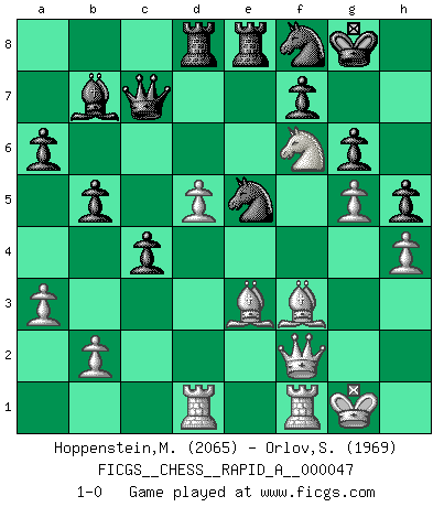 Last move : 1-0 2008 August 27 14:42:13 [Event "FICGS__CHESS__RAPID_A__000047"] [Site "FICGS"] [Date "2008.06.14"] [Round "1"] [White "Hoppenstein,Michael"] [Black "Orlov,Vladimir"] [Result "1-0"] [WhiteElo "2065"] [BlackElo "1969"] 1.d4 Nf6 2.c4 e6 3.Nf3 d5 4.g3 dxc4 5.Qa4+ c6 6.Qxc4 b5 7.Qd3 Bb7 8.Bg2 Nbd7 9.O-O a6 10.Nc3 c5 11.Rd1 Rc8 12.Bg5 c4 13.Qc2 Be7 14.a3 O-O 15.e4 h6 16.Be3 Re8 17.h3 Bf8 18.Nh4 Nb6 19.Rd2 Qc7 20.Bf4 Qd8 21.Nf3 Be7 22.Re1 Nh5 23.Be3 Nf6 24.Ne5 Qc7 25.f4 Rcd8 26.Rf1 Nbd7 27.R2d1 Rc8 28.Qf2 Rcd8 29.g4 Nh7 30.h4 Nhf8 31.g5 h5 32.Bf3 g6 33.d5 exd5 34.exd5 Bd6 35.Ne4 Bxe5 36.fxe5 Nxe5 37.Nf6+ 1-0 Queen's pawn game Kingside Castling by player White (move 9) Kingside Castling by player Black (move 14) Player White won this chess game. Follow this game move after move (download)There are two classes of men; those who are content to yield to circumstances and who play whist; those who aim to control circumstances, and who play Chess. (Mortimer Collins) Ein unbeabsichtigtes Patt ist der Gipfel der Dummheit. (Anonymous) Una buena ofensiva y una buena defensa, comienzan ambas con un buen desarrollo. (Bruce A. Moon) Les sacrifices démontrent seulement que quelqu'un a gaffé. (Savielly Tartacover) They say poker is a zero-sum game. It must be, because every time I play my sum ends up zero. (Max Shapiro)