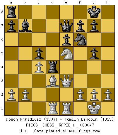 Last move : 1-0 2008 July 20 21:6:0 [Event "FICGS__CHESS__RAPID_A__000047"] [Site "FICGS"] [Date "2008.06.14"] [Round "1"] [White "Wosch,Arkadiusz"] [Black "Tomlin,Lincoln"] [Result "1-0"] [WhiteElo "1907"] [BlackElo "1955"] 1.e4 e6 2.d4 d5 3.Nc3 dxe4 4.Nxe4 Nd7 5.Nf3 Ngf6 6.Nxf6+ Nxf6 7.Bd3 Bd6 8.O-O O-O 9.Bg5 h6 10.Bh4 b6 11.Qe2 Bb7 12.Rad1 Bf4 13.c4 Qe7 14.Ne5 Rfd8 15.Rfe1 c5 16.dxc5 bxc5 17.Ng4 Bg5 18.Bxg5 hxg5 19.Ne5 Rd4 20.Qe3 1-0 French : Rubinstein variation Kingside Castling by player White (move 8) Kingside Castling by player Black (move 8) Player White won this chess game. Follow this game move after move (download)The boy (then a 12 year old boy named Anatoly Karpov) doesn't have a clue about Chess, and there's no future at all for him in this profession. (Mikhail Botvinnik) Jeder Fehler erscheint unglaublich dumm, wenn andre ihn begehen. (Georg Christoph Lichtenberg) Tu eres para mi la Reina en d8 y yo soy el Peón en d7!!. (GM Eduard Gufeld) Vous savez, camarade Pachman, je n'éprouve pas de plaisir à être ministre, je jouerais plutôt aux échecs comme vous, ou alors ferais une révolution au Venezuela. (Che Guevara à Ludek Pachman, 'Checkmate in Prague', 1975) The Internet isn't free. It just has an economy that makes no sense to capitalism. (Brad Shapcott)