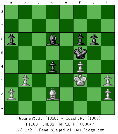 Last move : 1/2-1/2 2008 August 17 6:25:16 [Event "FICGS__CHESS__RAPID_A__000047"] [Site "FICGS"] [Date "2008.06.14"] [Round "1"] [White "Gounant,Stanislas"] [Black "Wosch,Arkadiusz"] [Result "1/2-1/2"] [WhiteElo "1958"] [BlackElo "1907"] 1.e4 c5 2.Nc3 Nc6 3.Nf3 e6 4.Bb5 Nge7 5.O-O a6 6.Bxc6 Nxc6 7.d4 cxd4 8.Nxd4 d6 9.Re1 Be7 10.Nxc6 bxc6 11.Qg4 Kf8 12.b3 h5 13.Qf3 e5 14.Na4 Qa5 15.Qe2 Bg4 16.f3 Be6 17.Be3 Rb8 18.c4 h4 19.Rac1 h3 20.c5 d5 21.exd5 Bxd5 22.Bd2 Qc7 23.Qxe5 Qxe5 24.Rxe5 g6 25.Be3 f6 26.Rxd5 cxd5 27.c6 Bd6 28.Nb6 Re8 29.Bf2 Rh7 30.gxh3 Rd8 31.Bc5 Rc7 32.Nd7 Rcxd7 33.cxd7 Ke7 34.Bb6 Rxd7 35.Rc6 Bb4 36.Bd4 Rd6 37.Rxd6 Bxd6 38.Kg2 Ke6 39.Bf2 Kd7 40.Bg3 Bc5 41.f4 Ke6 42.Kf3 Kf5 43.Be1 Bd6 44.Bd2 d4 1/2-1/2 Sicilian : Closed, 2...Nc6 Kingside Castling by player White (move 5) This chess game ended in a draw. Follow this game move after move (download)When you absolutely don't know what to do anymore, it is time to panic. (John van der Wiel) Versuche, dich von der Sklaverei der Eröffnungsvarianten zu befreien. Stattdessen soll man gewisse Typenpositionen erlernen, die man eingehend analysiert. (Aaron Nimzowitsch) Los Peones son el alma de una partida de Ajedrez. (Francois Andre Danican Philidor) Il n'y a plus de joueurs du niveau de Jacob Murray dont la seule quête est le beau jeu, le plaisir de voir les pièces construire quelque chose. Sur 10 idées à la minute, 9 seront sans intérêt, la dernière s'avèrera géniale. (Christian Bauer) No man has ever achieved immortality in his own life time. (Unknown)