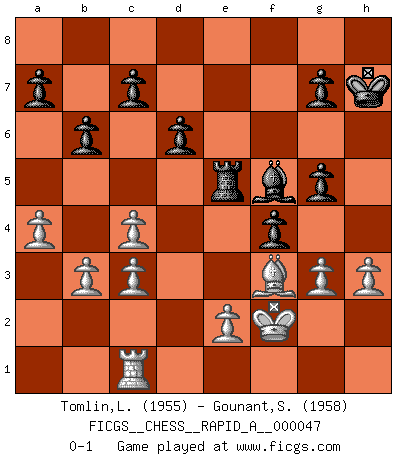 Last move : 0-1 2008 July 20 21:6:44 [Event "FICGS__CHESS__RAPID_A__000047"] [Site "FICGS"] [Date "2008.06.14"] [Round "1"] [White "Tomlin,Lincoln"] [Black "Gounant,Stanislas"] [Result "0-1"] [WhiteElo "1955"] [BlackElo "1958"] 1.c4 Nf6 2.Nc3 e5 3.g3 Bb4 4.Bg2 O-O 5.Nf3 Re8 6.O-O e4 7.Ne1 Bxc3 8.dxc3 d6 9.Nc2 Nc6 10.Bg5 h6 11.Bxf6 Qxf6 12.Ne3 Bf5 13.Qd5 Re5 14.Qd2 Qe6 15.Nd5 Qd7 16.b3 Ne7 17.Nf4 b6 18.Rad1 Re8 19.a4 Ng6 20.Nxg6 Bxg6 21.Qe3 Qf5 22.h3 Qg5 23.Qxg5 hxg5 24.Rd5 f5 25.Rxe5 Rxe5 26.f4 exf3 27.Bxf3 Kh7 28.Kf2 f4 29.Rc1 Bf5 0-1 English Opening Kingside Castling by player Black (move 4) Kingside Castling by player White (move 6) Player Black won this chess game. Follow this game move after move (download)Chess is a matter of delicate judgment, knowing when to punch and how to duck. (Bobby Fischer) Nie in meinem Leben habe ich die französische Verteidigung gespielt, welche die Stumpfsinnigste von allen ist. (Wilhelm Steinitz) Observen a Garry Kasparov. Después de una derrota, invariablemente el gana la próxima partida. Prácticamente hace pedazos a su siguiente oponente. Eso es algo que tenemos que aprender a lograr. (Maurice Ashley) Le jeu d'échecs fait naître et fortifie en nous plusieurs qualités précieuses dans le cours de l'existence, telles que la prévoyance, la circonspection, la prudence, et la persévérance. (Benjamin Franklin - 1783, la morale des échecs) Perhaps the current trend of many chess professionals taking up the more lucrative pastime of poker is not a wholly negative one. It may not be too late for humans to relearn how to take risks in order to innovate and thereby maintain the advanced lifestyles we enjoy. And if it takes a poker-playing supercomputer to remind us that we can't enjoy the rewards without taking the risks, so be it. (The Chess Master and the Computer, by Garry Kasparov - 2010)
