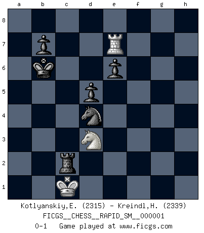 Last move : 0-1 2008 October 20 17:38:31 [Event "FICGS__CHESS__RAPID_SM__000001"] [Site "FICGS"] [Date "2008.06.15"] [Round "1"] [White "Kotlyanskiy,Edward"] [Black "Kreindl,Helmut"] [Result "0-1"] [WhiteElo "2315"] [BlackElo "2339"] 1.e4 c6 2.c3 d5 3.e5 Bf5 4.d4 Nd7 5.Bd3 Bxd3 6.Qxd3 e6 7.Ne2 c5 8.O-O Ne7 9.b4 c4 10.Qc2 a5 11.b5 a4 12.Nf4 Ng6 13.Nh5 Nh4 14.Nf4 Be7 15.g3 Ng6 16.Nxg6 hxg6 17.Ba3 Bxa3 18.Nxa3 Qe7 19.Qb2 f6 20.f4 O-O 21.exf6 gxf6 22.Rab1 Kg7 23.Qb4 Qxb4 24.Rxb4 Kf7 25.h4 Nb6 26.Kg2 Rfd8 27.Rh1 Nc8 28.Kf3 Nd6 29.b6 Ne4 30.Rc1 Rdc8 31.Rc2 Rc6 32.Nxc4 a3 33.g4 Rac8 34.Ne3 Rxc3 35.Rxc3 Rxc3 36.Ke2 f5 37.Ra4 fxg4 38.Ra7 Nd6 39.Kd2 Rc8 40.Nxg4 Rh8 41.Ne5+ Kf6 42.Rxa3 Rxh4 43.Ra8 Rxf4 44.Kd3 Nf5 45.Kc3 Rxd4 46.Nd7+ Ke7 47.Ne5 Kd6 48.Nxg6 Rg4 49.Rd8+ Kc5 50.Ne5 Rg3+ 51.Kd2 Ra3 52.Nd3+ Kxb6 53.Re8 Rxa2+ 54.Kc1 Nd4 55.Re7 Rc2+ 0-1 Caro-Kann defense Kingside Castling by player White (move 8) Kingside Castling by player Black (move 20) 10 pieces endgame at move 52 : White KRNP , Black KRNPPP WHITE : King + 1 Rook 1 Knight 1 Pawn BLACK : King + 1 Rook 1 Knight 3 Pawns 9 pieces endgame at move 53 : White KRN , Black KRNPPP WHITE : King + 1 Rook 1 Knight BLACK : King + 1 Rook 1 Knight 3 Pawns Player Black won this chess game. Follow this game move after move (download)All that matters on the Chessboard is good moves. (Bobby Fischer) Schach ist das Spiel, das die Verrückten gesund hält. (Albert Einstein) El Ajedrez es un mar en el cual un mosquito puede beber y un elefante puede bañarse. (Refrán Hindú) Demandez au pauvre Cg1 ce qu'il en pense. Eduard Gufeld à propos de la variante Saemisch de l'Est-Indienne. I believe in luck. How else can you explain the success of those you dislike ? (Jean Cocteau)