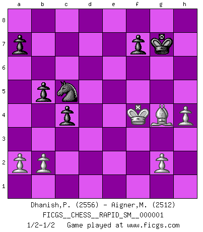 Last move : 1/2-1/2 2008 October 1 3:54:37 [Event "FICGS__CHESS__RAPID_SM__000001"] [Site "FICGS"] [Date "2008.06.15"] [Round "1"] [White "Dhanish,P. Bhaskaran"] [Black "Aigner,Michael"] [Result "1/2-1/2"] [WhiteElo "2556"] [BlackElo "2512"] 1.Nf3 Nf6 2.c4 e6 3.d4 d5 4.Nc3 c6 5.Bg5 h6 6.Bh4 dxc4 7.e4 g5 8.Bg3 b5 9.Ne5 h5 10.h4 g4 11.Be2 Bb7 12.O-O Nbd7 13.Qc2 Nxe5 14.Bxe5 Bg7 15.Rad1 O-O 16.Bg3 Nd7 17.f3 Qb6 18.Kh1 Rad8 19.fxg4 hxg4 20.Bd6 e5 21.Bxf8 Rxf8 22.d5 cxd5 23.Nxd5 Bxd5 24.exd5 Nf6 25.Kh2 Qe3 26.Qd2 Qxd2 27.Rxd2 Bh6 28.R2d1 Kg7 29.d6 Rd8 30.d7 Be3 31.Kg3 Bf4+ 32.Rxf4 exf4+ 33.Kxf4 Rxd7 34.Rxd7 Nxd7 35.Bxg4 Nc5 1/2-1/2 Reti Opening Kingside Castling by player White (move 12) Kingside Castling by player Black (move 15) This chess game ended in a draw. Follow this game move after move (download)It is not enough to be a good player... you must also play well. (Siegbert Tarrasch) Modernes Schach sorgt sich zuviel um Dinge wie Bauernstruktur usw. Vergessen Sie das, Schachmatt beendet das Spiel! (Nigel Short) El Ajedrez es el arte del análisis. (Mikhail Botvinnik) Le temps de noter son nom sur la feuille de partie, j'étais déjà en zeitnot ! D'un modeste amateur apparié lors de la première ronde d'un open contre le grand-maître Azmaïparashvili. Don't anthropomorphize computers - they hate it. (Anonymous)