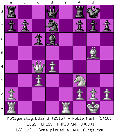 Last move : 1/2-1/2 2008 June 18 0:27:25 [Event "FICGS__CHESS__RAPID_SM__000001"] [Site "FICGS"] [Date "2008.06.15"] [Round "1"] [White "Kotlyanskiy,Edward"] [Black "Noble,Mark"] [Result "1/2-1/2"] [WhiteElo "2315"] [BlackElo "2416"] 1.e4 e5 2.Nf3 Nf6 3.Nxe5 d6 4.Nf3 Nxe4 5.d4 d5 6.Bd3 Bd6 7.O-O O-O 8.c4 c6 9.Re1 Bf5 10.Nc3 Nxc3 11.bxc3 Bxd3 12.Qxd3 dxc4 13.Qxc4 Nd7 14.Bg5 1/2-1/2 Petrov : Classical attack, Marshall variation Kingside Castling by player White (move 7) Kingside Castling by player Black (move 7) This chess game ended in a draw. Follow this game move after move (download)On the chessboard, lies and hypocrisy do not survive long. (Emanuel Lasker) Ich verstehe Aljechins Kombinationen ganz gut; aber woher er diese Angriffschancen bekommt und wie er die Eröffnung behandelt das ist für mich ein Buch mit sieben Siegeln. (Rudolf Spielmann) Observen a Garry Kasparov. Después de una derrota, invariablemente el gana la próxima partida. Prácticamente hace pedazos a su siguiente oponente. Eso es algo que tenemos que aprender a lograr. (Maurice Ashley) À la honte des hommes, on sait que les lois du jeu sont les seules qui soient partout justes, claires, inviolables et exécutées. Pourquoi l'Indien qui a donné les règles du jeu d'échecs est-il obéi de bon gré dans toute la terre, et que les décrétales des papes, par exemple, sont aujourd'hui un objet d'horreur et de mépris ? C'est que l'inventeur des échecs combina tout avec justesse pour la satisfaction des joueurs, et que les papes, dans leurs décrétales, n'eurent en vue que leur seul avantage. L'Indien voulut exercer également l'esprit des hommes et leur donner du plaisir; les papes ont voulu abrutir l'esprit des hommes. Voltaire (Dictionnaire philosophique / Garnier 1967) If we don't succeed, we run the risk of failure. (George W. Bush)