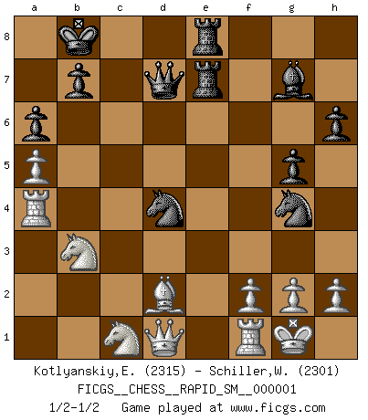 Last move : 1/2-1/2 2008 August 21 18:40:7 [Event "FICGS__CHESS__RAPID_SM__000001"] [Site "FICGS"] [Date "2008.06.15"] [Round "1"] [White "Kotlyanskiy,Edward"] [Black "Schiller,Wilfried"] [Result "1/2-1/2"] [WhiteElo "2315"] [BlackElo "2301"] 1.e4 c6 2.c3 d5 3.e5 Bf5 4.d4 e6 5.Be2 Nd7 6.Nf3 Nh6 7.O-O Bg6 8.Nbd2 Be7 9.Ne1 Nf5 10.Nd3 h6 11.Nf3 Bh7 12.Nf4 Qc7 13.a4 c5 14.Bd3 c4 15.Bb1 g5 16.Ne2 O-O-O 17.a5 a6 18.b3 cxb3 19.Qxb3 f6 20.exf6 Bxf6 21.Ra4 Nd6 22.Bxh7 Rxh7 23.Nd2 Nb8 24.c4 Nc6 25.cxd5 exd5 26.Qxd5 Kb8 27.Nb3 Nb5 28.Qe4 Re7 29.Qd3 Bg7 30.Bd2 Qd7 31.Be3 Ne5 32.Qd1 Ng4 33.Bd2 Rde8 34.Nec1 Nxd4 1/2-1/2 Caro-Kann defense Kingside Castling by player White (move 7) Queenside Castling by player Black (move 16) This chess game ended in a draw. Follow this game move after move (download)In Chess, just as in life, today's bliss may be tomorrow's poison. (Assaic) In der Schule lernt man nichts. Es ist nur Zeitverschwendung. (Robert James Fischer) Estaba muy claro de que el punto vulnerable del Gran Maestro Americano (Bobby Fischer) radicaba en las posiciones de doble filo, colgantes, irracionales, donde el siempre falló en encontrar un triunfo aún en una posición de clara victoria. (Efim Geller) Vous savez, camarade Pachman, je n'éprouve pas de plaisir à être ministre, je jouerais plutôt aux échecs comme vous, ou alors ferais une révolution au Venezuela. (Che Guevara à Ludek Pachman, 'Checkmate in Prague', 1975) The Internet is the first thing that humanity has build that humanity doesn't understand, the largest experiment in anarchy that we have ever had. (Eric Schmidt)