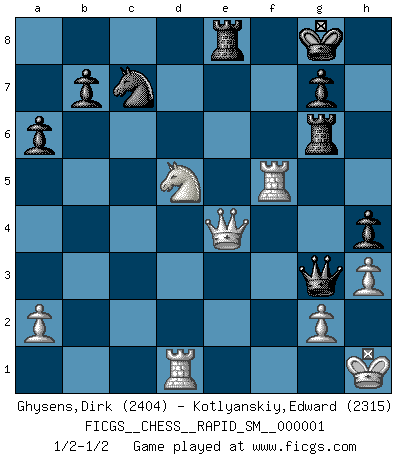 Last move : 1/2-1/2 2008 July 9 12:52:43 [Event "FICGS__CHESS__RAPID_SM__000001"] [Site "FICGS"] [Date "2008.06.15"] [Round "1"] [White "Ghysens,Dirk"] [Black "Kotlyanskiy,Edward"] [Result "1/2-1/2"] [WhiteElo "2404"] [BlackElo "2315"] 1.e4 c5 2.c3 Nf6 3.e5 Nd5 4.Nf3 Nc6 5.d4 cxd4 6.cxd4 d6 7.Bc4 dxe5 8.dxe5 Ndb4 9.Qb3 e6 10.O-O Na5 11.Bb5+ Bd7 12.Qa4 Bxb5 13.Qxb5+ Nac6 14.Nc3 a6 15.Qc4 Qd3 16.Qg4 h5 17.Qg3 h4 18.Qg4 Qh7 19.h3 Be7 20.Rd1 Nd3 21.Bg5 Bxg5 22.Ne4 Nxf2 23.Nd6+ Kf8 24.Kxf2 Qc2+ 25.Kg1 Be3+ 26.Kh1 Rh6 27.Ne1 Qxb2 28.Nd3 Qd4 29.Qf3 f5 30.Rab1 Nd8 31.Rb3 Bg5 32.Nxf5 exf5 33.Qxf5+ Bf6 34.exf6 Qxf6 35.Qc5+ Qd6 36.Qc2 Kg8 37.Nb4 Qg6 38.Qc7 Qg5 39.Rf3 Rg6 40.Qc2 Ne6 41.Rf5 Qg3 42.Nd5 Re8 43.Qe4 Nc7 1/2-1/2 Sicilian : Alapin's variation (2.c3) Kingside Castling by player White (move 10) This chess game ended in a draw. Follow this game move after move (download)I had a toothache during the first game. In the second game I had a headache. In the third game it was an attack of rheumatism. In the fourth game, I wasn't feeling well. And in the fifth game? Well, must one have to win every game ? (Siegbert Tarrasch) Über Kasparov: Es ist offensichtlich, daß er in einem totalitären Staat aufwuchs und deshalb zu diktatorischen Zügen neigt. (Viktor Kortschnoi) Aquel que teme a un Peón de Reina aislado, debería de retirarse del Ajedrez. (Siegbert Tarrasch) Si le désir cupide (et stupide) de gagner est une inépuisable source de souffrance, une combinaison brillante sur l'échiquier est une découverte : le coquelicot qui s'épanouit lorsque apparaît la Voie Lactée. (Arrabal) Hold em is to stud what chess is to checkers. (Johnny Moss)