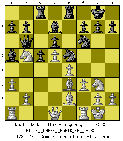 Last move : 1/2-1/2 2008 July 3 21:18:11 [Event "FICGS__CHESS__RAPID_SM__000001"] [Site "FICGS"] [Date "2008.06.15"] [Round "1"] [White "Noble,Mark"] [Black "Ghysens,Dirk"] [Result "1/2-1/2"] [WhiteElo "2416"] [BlackElo "2404"] 1.d4 e6 2.c4 Nf6 3.Nc3 Bb4 4.f3 c5 5.d5 exd5 6.cxd5 d6 7.e4 O-O 8.Nge2 Nbd7 9.Ng3 Re8 10.Be2 Ne5 11.O-O Bd7 12.Be3 Rc8 13.a3 Ba5 14.Nb5 Qb6 15.Nc3 Qd8 16.Nb5 Qb6 1/2-1/2 Queen's pawn Kingside Castling by player Black (move 7) Kingside Castling by player White (move 11) This chess game ended in a draw. Follow this game move after move (download)If your opponent offers you a draw, try to work out why he thinks he's worse off. (Nigel Short) Um sich vor der Gefahr einer Erkältung zu schützen, sorge der wanderlustige König beizeiten für ein brauchbares Versteck. (Aaron Nimzowitsch) Cuando me preguntan: -¿Cual es el secreto que te hace hacer mejores movidas que tus oponentes?, Yo respondo: Me da gusto que me pregunten eso, porque, como veran, hay una simple razón. Yo pienso mis propias movidas y dejo a mi oponente que el piense las suyas. (Alexander Alekhine) L'action d'une oeuvre littéraire se déroule sur un champ de bataille. Les masques et les types du drame moderne correspondent aux pièces du jeu d'échecs. L'intrigue correspond aux coups et aux gambits, c'est à dire aux techniques du jeu telles qu'utilisées et interprétées par les joueurs. Les tactiques et les péripéties [mouvements] correspondent aux coups exécutés par l'adversaire. (Viktor Shklovsky) An expert is a man who has made all the mistakes which can be made in a very narrow field. (Niels Bohr)