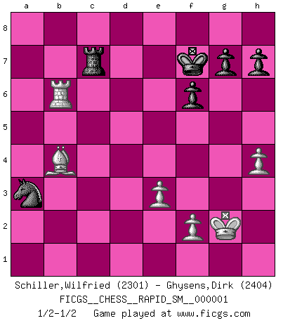 Last move : 1/2-1/2 2008 September 3 1:16:12 [Event "FICGS__CHESS__RAPID_SM__000001"] [Site "FICGS"] [Date "2008.06.15"] [Round "1"] [White "Schiller,Wilfried"] [Black "Ghysens,Dirk"] [Result "1/2-1/2"] [WhiteElo "2301"] [BlackElo "2404"] 1.d4 Nf6 2.c4 e6 3.g3 d5 4.Bg2 Be7 5.Nf3 O-O 6.Nc3 dxc4 7.O-O Nc6 8.e3 Nd5 9.Qe2 b6 10.Qxc4 Ndb4 11.Rd1 Ba6 12.Qb3 Na5 13.Qa4 c6 14.Rd2 Qe8 15.Ne5 Rc8 16.Be4 f6 17.Nd3 Nxd3 18.Bxd3 Bxd3 19.Rxd3 c5 20.dxc5 Bxc5 21.b3 Nc6 22.Bb2 Qg6 23.R3d1 Qc2 24.Rab1 Bb4 25.Rdc1 Qf5 26.Nb5 a5 27.a3 Bc5 28.Qf4 Qxf4 29.gxf4 Kf7 30.Rc4 Rfd8 31.Kg2 e5 32.b4 axb4 33.axb4 Bxb4 34.fxe5 Rd5 35.Rxb4 Nxb4 36.Nd6+ Rxd6 37.exd6 Nc2 38.d7 Rd8 39.Bc3 Rxd7 40.Rxb6 Na3 41.h4 Rc7 42.Bb4 1/2-1/2 Catalan : Closed, 5.Nf3 Kingside Castling by player Black (move 5) Kingside Castling by player White (move 7) This chess game ended in a draw. Follow this game move after move (download)You cannot play at Chess if you are kind-hearted. (French Proverb) Heutzutage gewinnt im Turnier nicht derjenige Spieler, der weitreichende Pläne entwirft, sondern einfach jener, der Zug um Zug kämpft. (David Bronstein) Si no le temes a Spassky, entonces elimino el elemento del dinero. (Jim Slater) Vous m'avez demandé de vous exposer quel est le fondement de la prière. Je ne fais que préparer les pièces du jeu sur la table... Nous sera-t-il permis d'en adopter les règles et si nous les appliquons scrupuleusement nous ne tarderons pas à faire mat le Roi divin ! Il ne pourra échapper à nos mains. (Sainte Thérèse d'Avila, Chemin de perfection) Pushing plastic is for the many, pushing virtual pieces is for the fewer, pushing wood is for the very few. (Normajean Yates)
