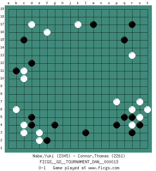 Last move : 0-1 2008 September 20 22:11:14 [Event "FICGS__GO__TOURNAMENT_DAN__000013 "] [Site "FICGS"] [Date "2008.06.16"] [Round "1"] [Black "Nabe,Yuki "] [White "Connor,Thomas "] [Result "0-1"] [Rating 1 "2345"] [Rating 2 "2261"] 1.q15 d17 2.p4 c3 3.d4 c4 4.d5 e2 5.g4 r4 6.r5 s5 7.q5 r6 8.s6 s7 9.s4 t6 10.r3 r13 11.r17 p7 12.c15 f16 13.d12 k17 14.m17 b6 15.f2 e3 16.l3 c10 17.b11 c11 0-1 This go game has been lost on time (started : 2008.06.16 14:37:53) Here are the names of the openings (joseki) played in the four corners : Corner d4 : c3 d4San-San (Sam-Sam, San-San) 3-3 Point. The San-San (3-3) point, emphasizing territory at the expense of influence.Kata-tsuki (shoulder hit). The shoulder-hit is the traditional answer to the 3-3. The direction of White 3 depends on the positions on the side. Crawling once may be the premise for a follow-up move of sliding with a knight's move in the opposite direction. If White plays 3 at 3-4 (to the right), the follow-on knight's move is then played at the top (e.g. 3-4, 4-5, 5-2). White's knight's move reduces territory potential on the side it is played. Corner q4 : p4 r4Takamoku (Gomok, Gaomu`) 5-4 Point. The takamoku (high) point (5-4). With its emphasis on influence, the 5-4 point complements the 4-4 (hoshi) point in creating an influence-oriented fuseki.Komoku. Black responds with 3-3, 3-5, 4-6, 4-7, 3-6, 3-7. Corner q16 : q15 r13Takamoku (Gomok, Gaomu`) 5-4 Point. The takamoku (high) point (5-4). With its emphasis on influence, the 5-4 point complements the 4-4 (hoshi) point in creating an influence-oriented fuseki. Corner d16 : d17 c15Komoku (Somok, Xiao~mu`) 3-4 Point. The komoku (3-4) point is the traditional corner enclosure move..Ikken Kakari (Hankan Keolch'im, Yi Gua`jiao~, 1-Space Low Pincer). The small knight move is the basic approach move to the 3-4 point stone. It has been continually used for over four centuries. There are limitless variations, with new moves constantly being discovered. Black 2 opens the door to a treaure store of joseki. Player White won this Go (weiqi, baduk) game.Follow this game move after move (download ) Add one stone, then sacrifice both. (Anonymous) Once you start thinking you have nothing left to learn, you have everything to learn. (Steve Badget)