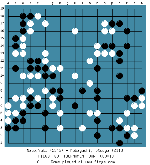 Last move : 0-1 2008 September 21 10:14:30 [Event "FICGS__GO__TOURNAMENT_DAN__000013 "] [Site "FICGS"] [Date "2008.06.16"] [Round "1"] [Black "Nabe,Yuki "] [White "Kobayashi,Tetsuya "] [Result "0-1"] [Rating 1 "2345"] [Rating 2 "2113"] 1.r16 d16 2.q3 p16 3.c4 r5 4.r7 q4 5.p3 r3 6.r2 s3 7.n4 h3 8.f3 l3 9.n2 s2 10.q1 c10 11.p17 o17 12.q17 o16 13.r14 k16 14.c17 d17 15.c16 c15 16.b15 c14 17.b14 c13 18.d18 e18 19.c18 f17 20.q10 p13 21.q12 k10 22.f10 g11 23.f11 f12 24.e12 f13 25.d12 d10 26.d11 e10 27.e11 f8 28.b11 b13 29.g10 h11 30.g8 g7 31.h8 e7 32.h7 g6 33.l8 m9 34.n11 m12 35.o14 o13 36.p14 n14 37.q13 n13 38.f5 h5 39.k6 m5 40.n7 n5 41.n8 c6 42.b6 b5 43.c5 b7 44.d6 c7 45.b4 a6 46.d7 d8 47.e6 a4 48.a3 a5 49.b3 s6 50.s7 t7 51.t8 t6 0-1 This go game has been lost on time (started : 2008.06.16 14:37:53) Here are the names of the openings (joseki) played in the four corners : Corner q16 : r16 p16Komoku (Somok, Xiao~mu`) 3-4 Point. The komoku (3-4) point is the traditional corner enclosure move..Ikken Takagakari (Hankan Nop'dakeolch'im, Yi Gaogua`jiao~, 1-Space High Approach). The 5-4 approach move has become more popular in modern times, as modern Go emphasizes speed and influence. Corner q4 : q3 r5Komoku (Somok, Xiao~mu`) 3-4 Point. The komoku (3-4) point is the traditional corner enclosure move..Ikken Kakari (Hankan Keolch'im, Yi Gua`jiao~, 1-Space Low Pincer). The small knight move is the basic approach move to the 3-4 point stone. It has been continually used for over four centuries. There are limitless variations, with new moves constantly being discovered. White 2 opens the door to a treaure store of joseki. Corner d4 : c4 h3Komoku (Somok, Xiao~mu`) 3-4 Point. The komoku (3-4) point is the traditional corner enclosure move.. Corner d16 : d16 c17Hoshi (Hwajeom, Seongjeom, Xingwei`) 4-4 Point. The star or hoshi (4-4) point, emphasizing influence at the potential expense of territory. Player White won this Go (weiqi, baduk) game.Follow this game move after move (download ) Grab the border points between two moyos. (Anonymous) I just play for fun. (Anna Kournikova)