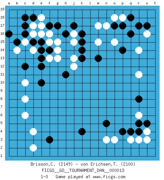Last move : 1-0 2008 September 21 22:14:50 [Event "FICGS__GO__TOURNAMENT_DAN__000013 "] [Site "FICGS"] [Date "2008.06.16"] [Round "1"] [Black "Brisson,Claude "] [White "von Erichsen,Thore "] [Result "1-0"] [Rating 1 "2149"] [Rating 2 "2100"] 1.q16 d16 2.q4 d4 3.f3 c6 4.k4 r6 5.r8 r3 6.r4 q3 7.p4 s4 8.s5 s3 9.r5 o3 10.n5 n3 11.f17 d14 12.k16 r14 13.o17 s16 14.r17 r11 15.c12 c10 16.e12 g15 17.c17 d17 18.c16 c15 19.d18 e18 20.c18 e17 21.b15 b14 22.a16 m17 23.s17 m15 24.h16 d2 25.k14 g13 26.e10 c8 27.h11 j13 28.k13 j12 29.m13 o15 30.p14 p18 31.p17 o18 32.q18 n17 33.f14 f13 34.e13 f15 35.e14 g14 36.e15 f16 37.g17 e16 38.d15 j15 39.k15 j16 40.j17 1-0 This go game has been lost on time (started : 2008.06.16 14:37:53) Here are the names of the openings (joseki) played in the four corners : Corner d4 : d4 f3Hoshi (Hwajeom, Seongjeom, Xingwei`) 4-4 Point. The star or hoshi (4-4) point, emphasizing influence at the potential expense of territory.Ikken Kakari (Hankan Keolch'im, Yi Gua`jiao~, 1-Space Low Approach). Black 2 is the standard approach move to the 4-4. Corner q4 : q4 r6Hoshi (Hwajeom, Seongjeom, Xingwei`) 4-4 Point. The star or hoshi (4-4) point, emphasizing influence at the potential expense of territory.Ikken Kakari (Hankan Keolch'im, Yi Gua`jiao~, 1-Space Low Approach). White 2 is the standard approach move to the 4-4. Corner d16 : d16 f17Hoshi (Hwajeom, Seongjeom, Xingwei`) 4-4 Point. The star or hoshi (4-4) point, emphasizing influence at the potential expense of territory.Ikken Kakari (Hankan Keolch'im, Yi Gua`jiao~, 1-Space Low Approach). Black 2 is the standard approach move to the 4-4. Corner q16 : q16 r14Hoshi (Hwajeom, Seongjeom, Xingwei`) 4-4 Point. The star or hoshi (4-4) point, emphasizing influence at the potential expense of territory.Ikken Kakari (Hankan Keolch'im, Yi Gua`jiao~, 1-Space Low Approach). White 2 is the standard approach move to the 4-4. Player Black won this Go (weiqi, baduk) game.Follow this game move after move (download ) The possibility or impossibility of an event results logically from the rules. (Pierre Audouard) The weakness of an artist is dogma. (Josh Waitzkin)