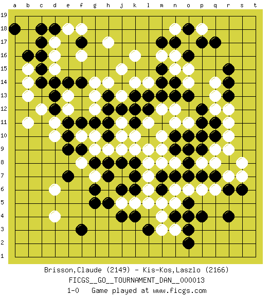 Last move : 1-0 2008 December 8 3:20:47 [Event "FICGS__GO__TOURNAMENT_DAN__000013"] [Site "FICGS"] [Date "2008.06.16"] [Round "1"] [Black "Brisson,Claude"] [White "Kis-Kos,Laszlo"] [Result "1-0"] [Rating 1 "2149"] [Rating 2 "2166"] 1.q17 d4 2.r4 d16 3.f3 d6 4.k4 r10 5.f17 h17 6.c17 d17 7.c16 d15 8.d18 e18 9.c18 f18 10.c14 c12 11.d13 d10 12.f14 e13 13.d12 d11 14.e14 e12 15.d14 f16 16.r14 q6 17.p4 o17 18.r8 q8 19.q7 r7 20.p7 p6 21.r6 s7 22.s6 s8 23.o7 o6 24.n7 n6 25.m7 o4 26.o3 n3 27.o5 n5 28.n4 m4 29.o4 l5 30.l3 m3 31.m6 m5 32.j6 k5 33.j4 j5 34.h5 h6 35.g5 j7 36.k6 l6 37.k7 l7 38.k8 l8 39.n10 p8 40.o8 l9 41.h7 l11 42.g8 n12 43.p11 q12 44.p12 q13 45.o13 q14 46.r15 o15 47.n14 l14 48.m15 k16 49.m17 o14 50.n13 n11 51.p9 q9 52.q10 r9 53.n9 m8 54.q11 r11 55.r13 r12 56.o18 n18 57.n17 n15 58.m14 p18 59.o16 n16 60.p17 m16 61.l13 k9 62.j8 k14 63.k13 j13 64.k11 j11 65.j14 j15 66.j12 h14 67.h11 j10 68.h13 g13 69.h12 g10 70.h10 k10 71.k12 h9 72.f11 f10 73.e11 g12 74.g11 g14 75.e10 g9 76.e9 f8 77.f9 g7 78.h8 j9 79.g6 m12 80.m13 m10 81.o2 o9 82.o10 n8 83.o9 m9 84.l12 o11 85.p10 b11 86.e7 b15 87.c15 b14 88.b16 b13 89.a18 1-0 Here are the names of the openings (joseki) played in the four corners : Corner d4 : d4 f3 Hoshi (Hwajeom, Seongjeom, Xingwei`) 4-4 Point. The star or hoshi (4-4) point, emphasizing influence at the potential expense of territory. Ikken Kakari (Hankan Keolch'im, Yi Gua`jiao~, 1-Space Low Approach). Black 2 is the standard approach move to the 4-4. Corner d16 : d16 f17 Hoshi (Hwajeom, Seongjeom, Xingwei`) 4-4 Point. The star or hoshi (4-4) point, emphasizing influence at the potential expense of territory. Ikken Kakari (Hankan Keolch'im, Yi Gua`jiao~, 1-Space Low Approach). Black 2 is the standard approach move to the 4-4. Corner q4 : r4 q6 Komoku (Somok, Xiao~mu`) 3-4 Point. The komoku (3-4) point is the traditional corner enclosure move.. Player Black won this Go (weiqi, baduk) game. Follow this game move after move (download)Keep inessential ataris till the end. (Anonymous) May I never be complete. May I never be content. May I never be perfect. Deliver me, Tyler, from being perfect and complete. (Chuck Palahniuk, Fight Club)