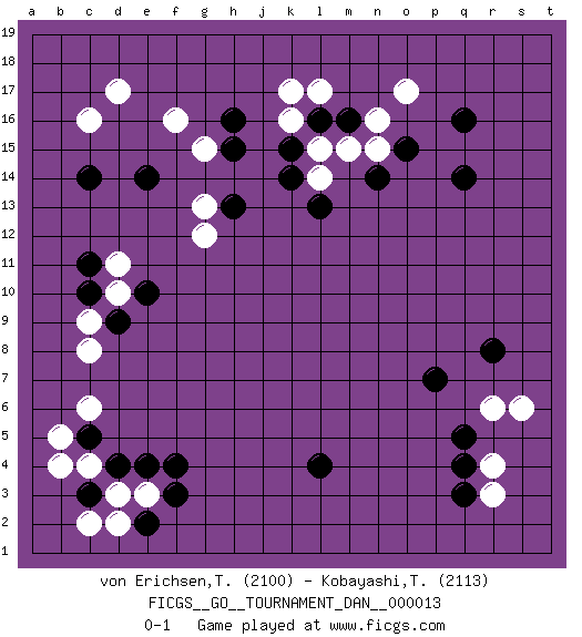 Last move : 0-1 2008 August 28 7:29:40 [Event "FICGS__GO__TOURNAMENT_DAN__000013 "] [Site "FICGS"] [Date "2008.06.16"] [Round "1"] [Black "von Erichsen,Thore "] [White "Kobayashi,Tetsuya "] [Result "0-1"] [Rating 1 "2100"] [Rating 2 "2113"] 1.q16 c4 2.q4 d17 3.e4 e3 4.d4 d3 5.c5 b5 6.c3 b4 7.f3 c2 8.e2 d2 9.f4 c6 10.l4 r6 11.r8 r3 12.q3 r4 13.q5 s6 14.p7 o17 15.q14 k16 16.c14 c16 17.c11 c9 18.e14 f16 19.h16 g15 20.h15 g13 21.k15 l15 22.k14 l14 23.l16 l17 24.m16 k17 25.l13 n15 26.n14 m15 27.o15 n16 28.h13 g12 29.d9 d10 30.c10 c8 31.e10 d11 0-1 This go game has been lost on time (started : 2008.06.16 14:37:53) Here are the names of the openings (joseki) played in the four corners : Corner d4 : c4 e4Komoku (Somok, Xiao~mu`) 3-4 Point. The komoku (3-4) point is the traditional corner enclosure move..Ikken Takagakari (Hankan Nop'dakeolch'im, Yi Gaogua`jiao~, 1-Space High Approach). The 5-4 approach move has become more popular in modern times, as modern Go emphasizes speed and influence. Corner q16 : q16 o17Hoshi (Hwajeom, Seongjeom, Xingwei`) 4-4 Point. The star or hoshi (4-4) point, emphasizing influence at the potential expense of territory.Ikken Kakari (Hankan Keolch'im, Yi Gua`jiao~, 1-Space Low Approach). White 2 is the standard approach move to the 4-4. Corner d16 : d17 c14Komoku (Somok, Xiao~mu`) 3-4 Point. The komoku (3-4) point is the traditional corner enclosure move..Nikken Kakari (Dukan Keolch'im, E`r Gua`jiao~, 2-Space Low Approach). Black 2 is used with friendly forces backing it up. Its purpose is to prevent a pincer. Locally it results in a loss, but may be appropriate fuseki strategy. It was popular in the late 1950s and early 1960s, but is not seen often nowadays, having been replaced by the one-space high approach, with which it has points in common. Player White won this Go (weiqi, baduk) game.Follow this game move after move (download ) The poor player plays the opponent's game for him. (Anonymous) Luck never gives; it only lends. (Swedish proverb)