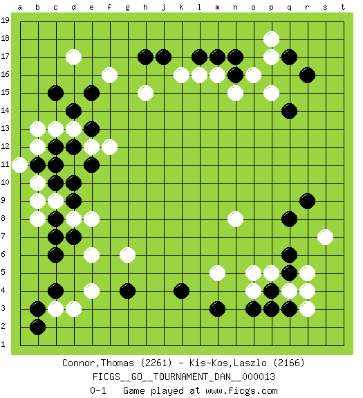 Last move : 0-1 2008 October 20 12:20:9 [Event "FICGS__GO__TOURNAMENT_DAN__000013 "] [Site "FICGS"] [Date "2008.06.16"] [Round "1"] [Black "Connor,Thomas "] [White "Kis-Kos,Laszlo "] [Result "0-1"] [Rating 1 "2261"] [Rating 2 "2166"] 1.r16 d17 2.q3 p17 3.c4 r5 4.n17 p15 5.q14 m16 6.q17 p18 7.m17 l16 8.n16 n15 9.l17 k16 10.j17 h15 11.h17 o16 12.r9 o4 13.q5 q4 14.p4 r4 15.p3 p5 16.q6 r3 17.o3 o5 18.m3 s7 19.q8 m5 20.k4 n8 21.d10 e4 22.g4 e6 23.c6 c3 24.b3 d3 25.b2 e8 26.d7 g6 27.c15 c13 28.e15 f16 29.d12 c9 30.d9 d8 31.c8 d13 32.e13 e12 33.c12 b12 34.b11 b13 35.d14 b8 36.c7 b10 37.c10 a11 38.c11 b9 39.e11 f12 0-1 This go game has been lost on time (started : 2008.06.16 14:37:53) Here are the names of the openings (joseki) played in the four corners : Corner q16 : r16 p17Komoku (Somok, Xiao~mu`) 3-4 Point. The komoku (3-4) point is the traditional corner enclosure move..Ikken Kakari (Hankan Keolch'im, Yi Gua`jiao~, 1-Space Low Pincer). The small knight move is the basic approach move to the 3-4 point stone. It has been continually used for over four centuries. There are limitless variations, with new moves constantly being discovered. White 2 opens the door to a treaure store of joseki. Corner q4 : q3 r5Komoku (Somok, Xiao~mu`) 3-4 Point. The komoku (3-4) point is the traditional corner enclosure move..Ikken Kakari (Hankan Keolch'im, Yi Gua`jiao~, 1-Space Low Pincer). The small knight move is the basic approach move to the 3-4 point stone. It has been continually used for over four centuries. There are limitless variations, with new moves constantly being discovered. White 2 opens the door to a treaure store of joseki. Corner d16 : d17 j17Komoku (Somok, Xiao~mu`) 3-4 Point. The komoku (3-4) point is the traditional corner enclosure move.. Corner d4 : c4 e4Komoku (Somok, Xiao~mu`) 3-4 Point. The komoku (3-4) point is the traditional corner enclosure move..Ikken Takagakari (Hankan Nop'dakeolch'im, Yi Gaogua`jiao~, 1-Space High Approach). The 5-4 approach move has become more popular in modern times, as modern Go emphasizes speed and influence. Player White won this Go (weiqi, baduk) game.Follow this game move after move (download ) In the opening, when you don't know what to play, make a shimari. (Jansteen) What doesn't kill us makes us stronger. (Friedrich Nietzsche)