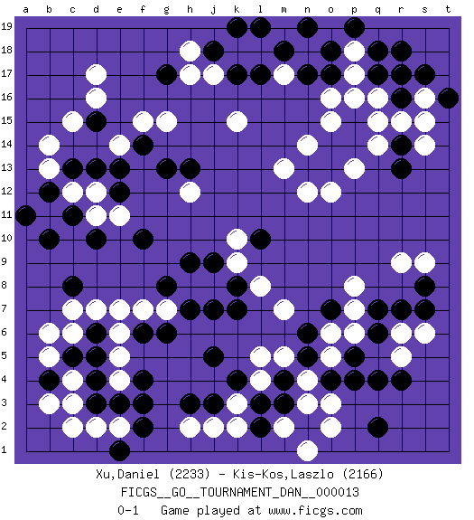 Last move : 0-1 2008 September 26 13:34:41 [Event "FICGS__GO__TOURNAMENT_DAN__000013"] [Site "FICGS"] [Date "2008.06.16"] [Round "1"] [Black "Xu,Daniel"] [White "Kis-Kos,Laszlo"] [Result "0-1"] [Rating 1 "2233"] [Rating 2 "2166"] 1.r16 d17 2.d4 p17 3.r13 c15 4.q4 c6 5.c8 c3 6.d3 c4 7.d5 b6 8.d6 k3 9.h3 o3 10.q2 r6 11.p5 r9 12.m3 m2 13.n2 n3 14.m4 o2 15.l2 n1 16.l3 o5 17.n5 o6 18.o4 n4 19.p4 m5 20.n6 l5 21.o7 p6 22.q6 p7 23.q7 p8 24.r7 k2 25.j5 m7 26.k17 m17 27.g17 q14 28.r14 r17 29.s17 q16 30.r18 r15 31.q17 s16 32.r17 s14 33.p16 q15 34.o17 p18 35.o18 d7 36.c11 e7 37.f6 f7 38.g6 e11 39.c13 g7 40.h7 o16 41.p15 o15 42.p14 p13 43.o14 n14 44.o13 o12 45.n13 m13 46.p19 n12 47.q18 p16 48.t16 s15 49.m18 l18 50.n17 m19 51.n19 n18 52.c5 b5 53.m18 r5 54.r4 n18 55.b4 b3 56.m18 e6 57.l19 e5 58.f2 d2 59.f4 e4 60.e3 e2 61.f3 h8 62.j7 e14 63.d10 j8 64.k7 k15 65.g13 g15 66.e13 d12 67.d13 c12 68.b12 b11 69.b10 b13 70.a11 b14 71.e12 d11 72.f10 h12 73.h13 h2 74.e1 c2 75.j3 j2 76.k4 l4 77.s8 s9 78.l10 l8 79.k8 k9 80.j9 k10 81.g8 c7 82.h9 s6 83.s7 k18 84.l17 j17 85.j18 h18 86.k19 h17 87.f14 f15 88.d15 d16 0-1 Here are the names of the openings (joseki) played in the four corners : Corner q16 : r16 p17 Komoku (Somok, Xiao~mu`) 3-4 Point. The komoku (3-4) point is the traditional corner enclosure move.. Ikken Kakari (Hankan Keolch'im, Yi Gua`jiao~, 1-Space Low Pincer). The small knight move is the basic approach move to the 3-4 point stone. It has been continually used for over four centuries. There are limitless variations, with new moves constantly being discovered. White 2 opens the door to a treaure store of joseki. Corner d4 : d4 c6 Hoshi (Hwajeom, Seongjeom, Xingwei`) 4-4 Point. The star or hoshi (4-4) point, emphasizing influence at the potential expense of territory. Ikken Kakari (Hankan Keolch'im, Yi Gua`jiao~, 1-Space Low Approach). White 2 is the standard approach move to the 4-4. Corner q4 : q4 o3 Hoshi (Hwajeom, Seongjeom, Xingwei`) 4-4 Point. The star or hoshi (4-4) point, emphasizing influence at the potential expense of territory. Ikken Kakari (Hankan Keolch'im, Yi Gua`jiao~, 1-Space Low Approach). White 2 is the standard approach move to the 4-4. Player White won this Go (weiqi, baduk) game. Follow this game move after move (download)If White takes all four corners, Black should resign; if Black takes all four corners, Black should also resign. (David Kent) He who laughs last probably does not get the joke. (Unknown)