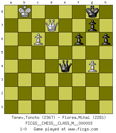 Last move : 1-0 2007 January 3 16:11:41 [Event "FICGS__CHESS__CLASS_M__000003"] [Site "FICGS"] [Date "2006.04.15"] [Round "1"] [White "Tenev,Toncho"] [Black "Florea,Mihai"] [Result "1-0"] [WhiteElo "2367"] [BlackElo "2281"] 1.e4 c5 2.Nf3 Nc6 3.d4 cxd4 4.Nxd4 Nf6 5.Nc3 e5 6.Ndb5 d6 7.Bg5 a6 8.Na3 b5 9.Nd5 Be7 10.Bxf6 Bxf6 11.c3 Bg5 12.Nc2 O-O 13.a4 bxa4 14.Rxa4 a5 15.Bc4 Rb8 16.Qa1 Ne7 17.Nce3 Bxe3 18.Nxe3 Bb7 19.O-O Bxe4 20.Rxa5 Rxb2 21.Rxe5 dxe5 22.Qxb2 Qc7 23.Qb4 Ba8 24.Rb1 Rd8 25.Qb3 Ng6 26.Rd1 Rxd1+ 27.Qxd1 Bb7 28.Qa4 Bc6 29.Qb4 h6 30.Qc5 Qd7 31.h3 Be4 32.Qb4 Bc6 33.Qb6 Be4 34.Qb3 Bc6 35.Kh2 Qc7 36.Bd5 e4 37.Kg1 Bxd5 38.Nxd5 Qe5 39.Qd1 Kh7 40.c4 Qb2 41.Ne3 Nf4 42.Qg4 Qe5 43.c5 Nd5 44.Qe2 Nxe3 45.Qxe3 Qa1+ 46.Kh2 Qe5+ 47.g3 Qd5 48.Qc3 Qc6 49.Qd4 Kg6 50.g4 f6 51.Kg2 e3 52.f3 e2 53.Kf2 e1Q+ 54.Kxe1 Qxf3 55.Qc4 Qxh3 56.c6 Qg3+ 57.Kd2 Qc7 58.Qd5 Qb8 59.Kc3 Qa7 60.Qh5+ Kh7 61.Qf5+ Kg8 62.Qe6+ Kh7 63.Kb4 Qb6+ 64.Kc4 Qc7 65.Qf5+ Kg8 66.Qd7 Qf4+ 67.Kb5 Qe5+ 68.Kb6 Qe3+ 69.Kb7 Qe4 70.Kb8 1-0 Sicilian : Pelikan (Lasker/Sveshnikov) variation Kingside Castling by player Black (move 12) Kingside Castling by player White (move 19) Promotion Queen by player Black (move 53) 10 pieces endgame at move 54 : White KQPPP , Black KQPPP WHITE : King + 1 Queen 3 Pawns BLACK : King + 1 Queen 3 Pawns 9 pieces endgame at move 55 : White KQPP , Black KQPPP WHITE : King + 1 Queen 2 Pawns BLACK : King + 1 Queen 3 Pawns Player White won this chess game. Follow this game move after move (download)He who fears an isolated Queen's Pawn should give up Chess. (Siegbert Tarrasch) Ein typischer, sehr verbreiteter Gedankenschädling ist der, daß der betreffende Amateur von der Annanhme ausgeht, daß jeder einzelne Zug etwas zu leisten habe. (Aaron Nimzowitsch) El Ajedrez es un cuento de Hadas de las 1001 metidas de pata. (Savielly Tartakower) Le moment que je préfère le plus dans une rencontre, c'est celui où je sens que la personnalité de l'adversaire se brise. (Robert Fischer) The meaning of life is that it is to be lived, and it is not to be traded and conceptualized and squeezed into a pattern of systems. (Bruce Lee)