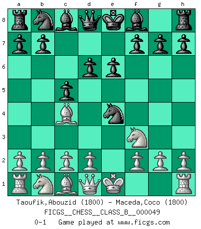 Last move : 0-1 2008 August 2 16:54:5 [Event "FICGS__CHESS__CLASS_B__000049"] [Site "FICGS"] [Date "2008.06.17"] [Round "1"] [White "Taoufik,Abouzid"] [Black "Maceda,Coco"] [Result "0-1"] [WhiteElo "1800"] [BlackElo "1800"] 1.e4 c5 2.Nf3 d6 3.Bc4 Nf6 4.Ng5 e6 5.Nf3 Nxe4 0-1 This chess game has been lost on time (started : 2008.06.17 14:30:4) Sicilian Player Black won this chess game. Follow this game move after move (download)When you play Bobby, it is not a question if you win or lose. It is a question if you survive. (Boris Spassky) Man wirke der falschen Auffassung entgegen, als ob jeder Zug Unmittelbares zu leisten habe; auch Werte- und Ruhezüge haben ihre Existenzberechtigung. (Aaron Nimzowitsch) Del Ajedrez se ha dicho que la vida no es lo suficientemente larga para él, pero eso es culpa de la vida, no del Ajedrez. (William Ewart Napier) L'ordinateur a tué l'originalité. Il n'y a plus guère d'aventures sur l'échiquier. (Jacob Murray) The quality of decision is like the well-timed swoop of a falcon which enables it to strike and destroy its victim. (Sun Tzu)