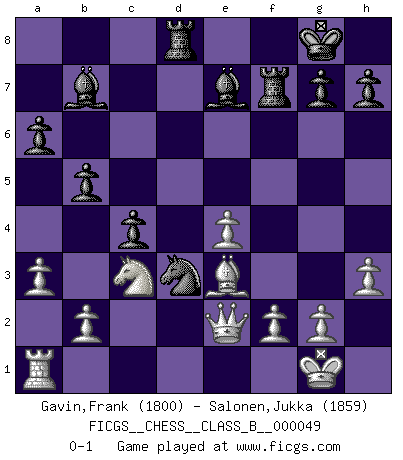 Last move : 0-1 2008 September 15 21:50:33 [Event "FICGS__CHESS__CLASS_B__000049"] [Site "FICGS"] [Date "2008.06.17"] [Round "1"] [White "Gavin,Frank"] [Black "Salonen,Jukka"] [Result "0-1"] [WhiteElo "1800"] [BlackElo "1859"] 1.e4 e5 2.Nf3 Nc6 3.Bb5 a6 4.Ba4 Nf6 5.O-O Be7 6.Re1 b5 7.Bb3 O-O 8.h3 Bb7 9.d3 d6 10.a3 Nd4 11.Nxd4 exd4 12.c3 dxc3 13.Nxc3 c6 14.Qf3 Nd7 15.d4 c5 16.dxc5 dxc5 17.Rd1 Ne5 18.Bxf7 Rxf7 19.Rxd8 Rxd8 20.Qe2 Nd3 21.Be3 c4 0-1 Ruy Lopez : Closed, 7...O-O Kingside Castling by player White (move 5) Kingside Castling by player Black (move 7) Player Black won this chess game. Follow this game move after move (download)Chess is a more highly symbolic game, but the aggressions are therefore even more frankly represented in the play. It probably began as a war game; that is, the representation of a miniature battle between the forces of two kingdoms. (Karl Meninger) Frage: Was machen Sie mit den Preisen? Anwort: Ich habe Angst, dass meine Freundin davon neue Kleider kauft. (Loek van Wely) Aunque la mayoría de la gente disfruta observar las partidas de los grandes Maestros de ataque, algunos de los jugadores mas notables en la historia han sido los jugadores silenciosos posicionales. Lentamente ellos te aplastan despojandote de tu espacio, congestionando tus piezas y dejandote virtualmente sin nada que hacer. (Yasser Seirawan) Je fais ceci parce que dans cinquante coups j'obtiendrai cela; je m'appelle Mikhail Moisevitch Botvinnik. (Botvinnik) A government big enough to give you everything you want is strong enough to take everything you have. (Thomas Jefferson)