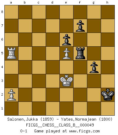 Last move : 0-1 2008 October 10 18:3:59 [Event "FICGS__CHESS__CLASS_B__000049"] [Site "FICGS"] [Date "2008.06.17"] [Round "1"] [White "Salonen,Jukka"] [Black "Yates,Normajean"] [Result "0-1"] [WhiteElo "1859"] [BlackElo "1800"] 1.e4 c5 2.Nf3 Nc6 3.d4 cxd4 4.Nxd4 g6 5.Nc3 Bg7 6.Nxc6 bxc6 7.Bc4 Qc7 8.O-O Nf6 9.Qe2 d6 10.Rb1 O-O 11.f3 Nd7 12.Be3 Ne5 13.Ba6 Bxa6 14.Qxa6 e6 15.Na4 d5 16.Rbd1 dxe4 17.fxe4 Ng4 18.Bf4 Be5 19.g3 Bxf4 20.Rxf4 Ne3 21.Rc1 Qe5 22.Qd3 g5 23.Rf3 Ng4 24.h3 Rad8 25.Qc4 Nf6 26.Re1 g4 27.Qc3 Qxc3 28.Rxc3 gxh3 29.Kh2 Rd2+ 30.Kxh3 h5 31.Rce3 Rxc2 32.R1e2 Rxe2 33.Rxe2 Rd8 34.e5 Ng4 35.b3 Rd5 36.Nc3 Rd4 37.Na4 Kg7 38.Nb2 a5 39.Kg2 Kg6 40.Kh3 Kg5 41.Nc4 a4 42.Nd2 Kg6 43.Nf3 Rd3 44.Nh4+ Kg5 45.bxa4 Ra3 46.Kg2 Rxa4 47.Nf3+ Kg6 48.Nh4+ Kh6 49.Nf3 c5 50.Nh2 Kg6 51.Nxg4 hxg4 52.Rf2 Kg5 53.Kf1 Ra3 54.Rc2 Rxg3 55.Rxc5 Kf4 56.Ra5 Re3 57.Ra4+ Kg3 58.Ra5 Rf3+ 59.Ke2 Rf5 60.Ke3 Kh2 0-1 Sicilian : Accelerated Fianchetto, Modern variation Kingside Castling by player White (move 8) Kingside Castling by player Black (move 10) 10 pieces endgame at move 54 : White KRPP , Black KRPPPP WHITE : King + 1 Rook 2 Pawns BLACK : King + 1 Rook 4 Pawns 9 pieces endgame at move 55 : White KRPP , Black KRPPP WHITE : King + 1 Rook 2 Pawns BLACK : King + 1 Rook 3 Pawns Player Black won this chess game. Follow this game move after move (download)Fischer is completely natural. He plays no roles. He's like a child. Very, very simple. (Zita Rajcsanyi) Heutzutage gewinnt im Turnier nicht derjenige Spieler, der weitreichende Pläne entwirft, sondern einfach jener, der Zug um Zug kämpft. (David Bronstein) Si el ingenio solamente fuese necesario para lucirse, las mujeres serían las mejores jugadoras de Ajedrez del mundo. (Albin) On entre au jeu d'Echecs comme on entre en Religion. Pour le joueur d'Echecs, la partie d'Echecs c'est l'office, la messe, le défilé du 1er Mai, le dépôt de gerbe au Monument aux Morts. C'est un drame sacré. (Michel Roos) If we knew what we were doing, we would not call it research. (Albert Einstein)