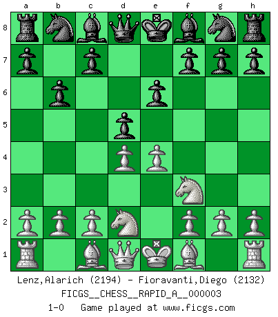 Last move : 1-0 2006 August 15 19:18:31 [Event "FICGS__CHESS__RAPID_A__000003"] [Site "FICGS"] [Date "2006.07.21"] [Round "1"] [White "Lenz,Alarich"] [Black "Fioravanti,Diego"] [Result "1-0"] [WhiteElo "2194"] [BlackElo "2132"] 1.d4 e6 2.e4 d5 3.Nd2 b6 4.Ngf3 1-0 Queen's pawn Player White won this chess game. Follow this game move after move (download)A win by an unsound combination, however showy, fills me with artistic horror. (Wilhelm Steinitz) Es macht mich traurig, wenn ich sehe, dass Golfprofis mehr verdienen als Schachsportler. Obwohl ich davon überzeugt bin, dass wir Schachspieler viel härter trainieren müssen als die Golfer. (Alexandra Kosteniuk) Si un gobernante no entiende al Ajedrez, ¿como puede governar él un reinado?. (El Rey Khusros II) Il vaut mieux sacrifier les pièces de l'adversaire. (Xavier Tartacover) He who laughs last probably does not get the joke. (Unknown)