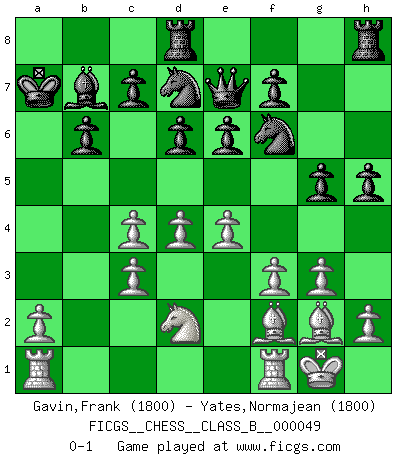 Last move : 0-1 2008 July 17 12:7:40 [Event "FICGS__CHESS__CLASS_B__000049"] [Site "FICGS"] [Date "2008.06.17"] [Round "1"] [White "Gavin,Frank"] [Black "Yates,Normajean"] [Result "0-1"] [WhiteElo "1800"] [BlackElo "1800"] 1.d4 Nf6 2.c4 e6 3.Nc3 Bb4 4.Nf3 b6 5.Bg5 h6 6.Bh4 Bb7 7.Nd2 Bxc3 8.bxc3 g5 9.Bg3 d6 10.f3 Nbd7 11.e4 Nh5 12.Bf2 Qe7 13.g3 O-O-O 14.Bg2 Nhf6 15.Qa4 Kb8 16.O-O h5 17.Qxa7 Kxa7 0-1 Nimzo-Indian : Three knights variation Queenside Castling by player Black (move 13) Kingside Castling by player White (move 16) Player Black won this chess game. Follow this game move after move (download)I look one move ahead... the best ! (Siegbert Tarrasch) Ich rechne überhaupt nicht voraus. Ich gewinne auch so. (Robert James Fischer) Por la belleza de sus partidas, la claridad de su juego y lo brillante de sus ideas, Fischer se creó el mismo como un artista de la misma estatura como Brahms, Rembrandt y Shakespeare. (David Levy) Aucun coup ne doit être joué sans but. (Pedro Damiano) Whenever people agree with me, I always feel I must be wrong. (Oscar Wilde)