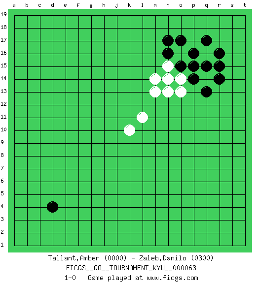 Last move : 1-0 2008 July 9 17:52:29 [Event "FICGS__GO__TOURNAMENT_KYU__000063"] [Site "FICGS"] [Date "2008.06.18"] [Round "1"] [Black "Tallant,Amber"] [White "Zaleb,Danilo"] [Result "1-0"] [Rating 1 "0000"] [Rating 2 "0300"] 1.d4 q16 2.r15 k10 3.q15 p15 4.p14 q14 5.p16 l11 6.o15 o14 7.p15 o16 8.q17 n13 9.r16 n15 10.q13 n14 11.r14 o13 12.n16 m14 13.o17 m13 14.n17 1-0 Here are the names of the openings (joseki) played in the four corners : Corner q16 : q16 r15 Hoshi (Hwajeom, Seongjeom, Xingwei`) 4-4 Point. The star or hoshi (4-4) point, emphasizing influence at the potential expense of territory. Player Black won this Go (weiqi, baduk) game. Follow this game move after move (download)There is damezumari at the bamboo joint. (Anonymous) Question: Is 'This statement is paradoxical' a paradoxical statement ? Or is it a meta-paradox ? (Normajean Yates)