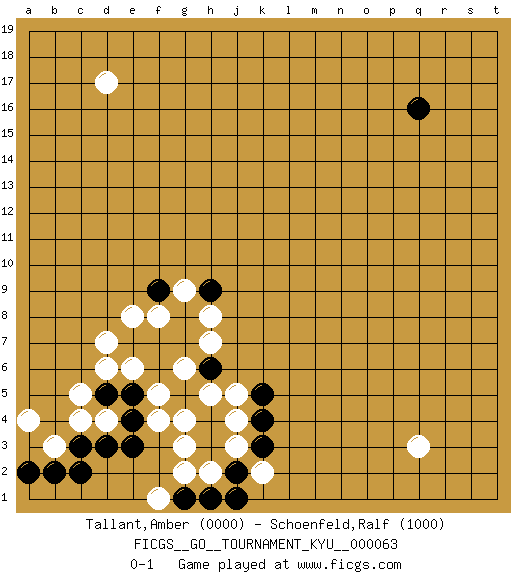 Last move : 0-1 2008 June 23 23:24:24 [Event "FICGS__GO__TOURNAMENT_KYU__000063"] [Site "FICGS"] [Date "2008.06.18"] [Round "1"] [Black "Tallant,Amber"] [White "Schoenfeld,Ralf"] [Result "0-1"] [Rating 1 "0000"] [Rating 2 "1000"] 1.q16 c4 2.d3 d4 3.e3 d17 4.e4 d6 5.e5 e6 6.f6 q3 7.e7 d7 8.d5 c5 9.c3 b3 10.c2 f5 11.b2 a4 12.f7 g4 13.g5 f4 14.h4 g3 15.h3 g2 16.a2 h2 17.j2 h5 18.h6 g6 19.g7 j5 20.k5 j3 21.k4 j4 22.j1 h7 23.k3 h8 24.g8 g9 25.h9 e8 26.f9 f8 27.g1 f1 28.h1 k2 0-1 Here are the names of the openings (joseki) played in the four corners : Corner d4 : c4 d3 Komoku (Somok, Xiao~mu`) 3-4 Point. The komoku (3-4) point is the traditional corner enclosure move.. Player White won this Go (weiqi, baduk) game. Follow this game move after move (download)Never try to cut bamboo joints. (Anonymous) He is a liar. I just don't know what the lie is yet. (Horatio Caine, C.S.I. Miami)
