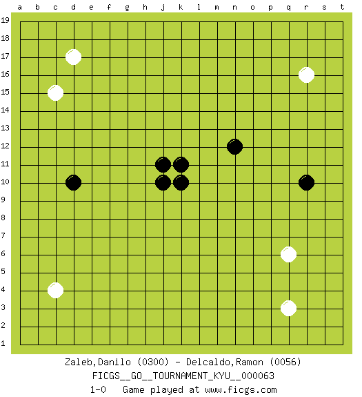 Last move : 1-0 2008 July 1 23:6:57 [Event "FICGS__GO__TOURNAMENT_KYU__000063"] [Site "FICGS"] [Date "2008.06.18"] [Round "1"] [Black "Zaleb,Danilo"] [White "Delcaldo,Ramon"] [Result "1-0"] [Rating 1 "0300"] [Rating 2 "0056"] 1.k10 r16 2.r10 d17 3.d10 q3 4.j11 c4 5.j10 c15 6.n12 q6 7.k11 1-0 Here are the names of the openings (joseki) played in the four corners : Corner d16 : d17 j11 Komoku (Somok, Xiao~mu`) 3-4 Point. The komoku (3-4) point is the traditional corner enclosure move.. Corner q16 : r16 n12 Komoku (Somok, Xiao~mu`) 3-4 Point. The komoku (3-4) point is the traditional corner enclosure move.. Player Black won this Go (weiqi, baduk) game. Follow this game move after move (download)Don't be greedy ! (Anonymous) The leaves of memory seemed to make a mournful rustling in the dark. (Henry Wadsworth Longfellow)