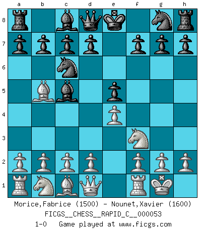 Last move : 1-0 2008 August 12 17:48:9 [Event "FICGS__CHESS__RAPID_C__000053"] [Site "FICGS"] [Date "2008.06.23"] [Round "1"] [White "Morice,Fabrice"] [Black "Nounet,Xavier"] [Result "1-0"] [WhiteElo "1500"] [BlackElo "1600"] 1.e4 e5 2.Nf3 Nc6 3.Bb5 Bc5 4.O-O 1-0 This chess game has been lost on time (started : 2008.06.23 1:8:51) Ruy Lopez : Classical (Cordel) defense Kingside Castling by player White (move 4) Player White won this chess game. Follow this game move after move (download)A thorough understanding of the typical mating continuations makes the most complicated sacrificial combinations leading up to them not only not difficult, but almost a matter of course. (Siegbert Tarrasch) Es ist besser die Steine des Gegners zu opfern. (Savielly Grigorievitsch Tartakower) Aún el Rey más flojo huye despavorido ante la amenaza de un Jaque doble. (Aaron Nimzowitsch) Les Echecs représentent une sphère d'idées créatrices basée sur la volonté des deux protagonistes. (Smyslov) Big Chess is a place for big hallucinations. (Thibault de Vassal)