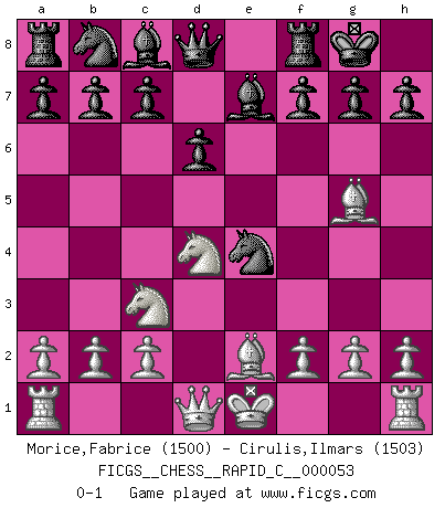 Last move : 0-1 2008 August 5 17:0:46 [Event "FICGS__CHESS__RAPID_C__000053"] [Site "FICGS"] [Date "2008.06.23"] [Round "1"] [White "Morice,Fabrice"] [Black "Cirulis,Ilmars"] [Result "0-1"] [WhiteElo "1500"] [BlackElo "1503"] 1.e4 e5 2.Nf3 d6 3.d4 exd4 4.Nxd4 Nf6 5.Nc3 Be7 6.Be2 O-O 7.Bg5 Nxe4 0-1 This chess game has been lost on time (started : 2008.06.23 1:8:51) Philidor : Exchange variation Kingside Castling by player Black (move 6) Player Black won this chess game. Follow this game move after move (download)It is the aim of the modern school, not to treat every position according to one general law, but according to the principle inherent in the position. (Richard Reti) Ich rechne überhaupt nicht voraus. Ich gewinne auch so. (Robert James Fischer) De todos mis libros Rusos, la defensa contiene y difunde el 'calor' mas grande que pudiese verse extraño al observar lo supremamente abstracto que el Ajedrez supuestamente es. (Vladimir Nabokov) Un footballeur joue avec ses pieds, parfois avec sa tête. Un joueur d'échecs ne joue qu'avec sa tête. Et quand il ne joue plus, il meurt. (Jacob Murray) Only sick music makes money today. (Friedrich Nietzsche)