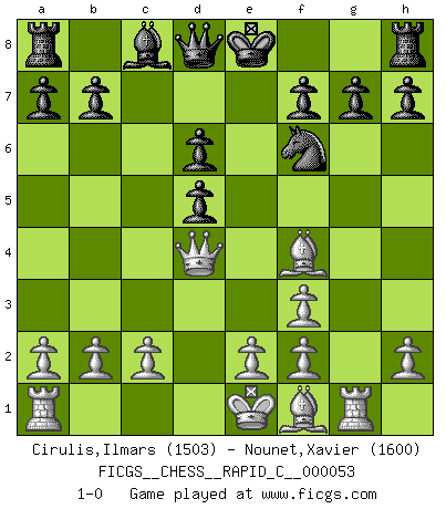 Last move : 1-0 2008 August 16 6:9:1 [Event "FICGS__CHESS__RAPID_C__000053"] [Site "FICGS"] [Date "2008.06.23"] [Round "1"] [White "Cirulis,Ilmars"] [Black "Nounet,Xavier"] [Result "1-0"] [WhiteElo "1503"] [BlackElo "1600"] 1.d4 e5 2.dxe5 Nc6 3.Nc3 Nxe5 4.Nf3 d6 5.Bf4 Nxf3+ 6.gxf3 Nf6 7.Qd4 d5 8.Nb5 Bd6 9.Nxd6+ cxd6 10.Rg1 1-0 This chess game has been lost on time (started : 2008.06.23 1:8:51) Queen's pawn : Charlick (Englund) gambit Player White won this chess game. Follow this game move after move (download)Daring ideas are like Chess men moved forward. They may be beaten, but they may start a winning game. (Johann Wolfgang von Goethe) Schach sollte überall auf der Welt Schulfach werden. Es fördert die geistige Auseinandersetzung. Es lehrt die Demut in der Niederlage. (Garry Kasparov) La vida es como un juego de Ajedrez, cambiando con cada movimiento. (Proverbio Chino) Ce n'est pas pour s'amuser qu'il joue aux échecs : il célèbre un culte. (Vladimir Nabokov) Life is painting a picture, not doing a sum. (Oliver Wendell Holmes, Jr.)