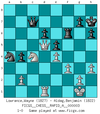 Last move : 1-0 2006 November 9 3:49:48 [Event "FICGS__CHESS__RAPID_A__000003"] [Site "FICGS"] [Date "2006.07.21"] [Round "1"] [White "Lowrance,Wayne"] [Black "Aldag,Benjamin"] [Result "1-0"] [WhiteElo "1827"] [BlackElo "1822"] 1.e4 e5 2.Nf3 Nc6 3.Bb5 a6 4.Ba4 Nf6 5.O-O b5 6.Bb3 Be7 7.a4 Bb7 8.d3 O-O 9.Re1 d6 10.Nc3 b4 11.Nd5 Na5 12.Nxe7+ Qxe7 13.Ba2 Bc8 14.h3 c5 15.Bg5 Be6 16.Bxe6 fxe6 17.c3 Qb7 18.Rb1 Rac8 19.cxb4 cxb4 20.Bxf6 Rxf6 21.d4 exd4 22.Qxd4 e5 23.Qe3 h6 24.Rbc1 Rc6 25.Rxc6 Nxc6 26.Qd3 Kh7 27.Rc1 Na5 28.Nh2 Qb6 29.Ng4 Rf7 30.Rd1 Nb7 31.Ne3 a5 32.Qd5 Qc7 33.Nc4 Nc5 34.Nxa5 Nxa4 35.Nc4 Rf6 36.f3 1-0 This chess game has been lost on time (started : 2006.07.21 10:12:50) Ruy Lopez : Wing attack Kingside Castling by player White (move 5) Kingside Castling by player Black (move 8) Player White won this chess game. Follow this game move after move (download)It is peculiar but a fact nevertheless, that gamblers in chess always have enthusiastic followers. (Botvinnik) Ich verachte Kasparow. (Viktor Kortschnoi) Fischer deseaba darle a los Rusos una sopa de su propia medicina. (Larry Evans) Si je n'étais pas joueur d'échecs, je serais le meilleur dans quelque chose d'autre. (Anatoli Karpov) A journey of a thousand sites begins with a single click. (Author unknown)