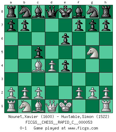 Last move : 0-1 2008 August 1 4:52:5 [Event "FICGS__CHESS__RAPID_C__000053"] [Site "FICGS"] [Date "2008.06.23"] [Round "1"] [White "Nounet,Xavier"] [Black "Huxtable,Simon"] [Result "0-1"] [WhiteElo "1600"] [BlackElo "1522"] 1.e4 c6 2.Nf3 d5 3.d4 dxe4 4.Ng5 c5 5.Bc4 e6 0-1 This chess game has been lost on time (started : 2008.06.23 1:8:51) Caro-Kann defense Player Black won this chess game. Follow this game move after move (download)In Chess, as it is played by masters, chance is practically eliminated. (Emanuel Lasker) Er war ein guter Schachspieler, aber ich kann Leute nicht ausstehen, die 'Heil Hitler' rufen (Über Alexander Aljechin). (Miguel Najdorf) Nada excita más a Grandes Maestros aburridos que una novedad teórica. (Dominic Lawson) Le succès, c'est être capable d'aller d'échec en échec sans perdre son enthousiasme. (Winston Churchill) When you have everything, sometimes it feels like nothing. (Horatio Caine, C.S.I. Miami)
