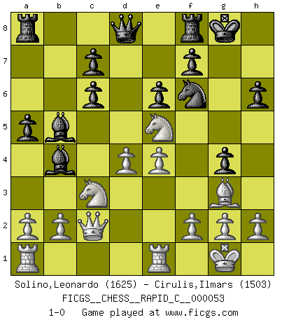 Last move : 1-0 2008 August 26 21:57:21 [Event "FICGS__CHESS__RAPID_C__000053"] [Site "FICGS"] [Date "2008.06.23"] [Round "1"] [White "Solino,Leonardo"] [Black "Cirulis,Ilmars"] [Result "1-0"] [WhiteElo "1625"] [BlackElo "1503"] 1.d4 Nf6 2.c4 d5 3.cxd5 Qxd5 4.Nc3 Qd8 5.Nf3 e6 6.e4 Nc6 7.Bb5 Bb4 8.Bxc6+ bxc6 9.Qa4 a5 10.O-O O-O 11.Bg5 Ba6 12.Rfe1 Bb5 13.Qc2 h6 14.Bh4 g5 15.Bg3 g4 16.Ne5 1-0 Queen's pawn game Kingside Castling by player White (move 10) Kingside Castling by player Black (move 10) Player White won this chess game. Follow this game move after move (download)The combination player thinks forward; he starts from the given position, and tries the forceful moves in his mind. (Emanuel Lasker) Ich las kürzlich ein Buch von Nietzsche. Er sagte Religion verdumme nur die Menschen. Ich stimme zu. (Robert James Fischer) El Ajedrez es una hermosa aventura. (Bent Larsen) Les échecs sont utiles à l'exercice de la faculté de penser et à celle de l'imagination. Car nous devons posséder une méthode élaborée pour atteindre des buts partout où nous devons conduire notre raison. (Leibnitz) It is not titles that honor men, but men that honor titles. (Niccolo Machiavelli)