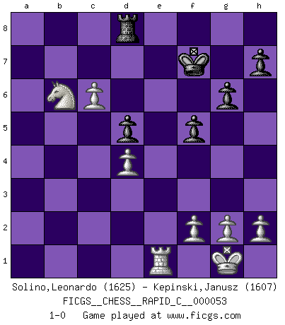 Last move : 1-0 2008 October 1 19:49:57 [Event "FICGS__CHESS__RAPID_C__000053"] [Site "FICGS"] [Date "2008.06.23"] [Round "1"] [White "Solino,Leonardo"] [Black "Kepinski,Janusz"] [Result "1-0"] [WhiteElo "1625"] [BlackElo "1607"] 1.e4 e6 2.d4 d5 3.Nc3 Nf6 4.Bg5 dxe4 5.Nxe4 Be7 6.Bxf6 Bxf6 7.Nf3 Be7 8.Bc4 O-O 9.O-O c6 10.Qe2 b5 11.Bd3 Nd7 12.c3 Bb7 13.b4 a5 14.a3 axb4 15.axb4 Nb6 16.Nc5 Bxc5 17.bxc5 Nd5 18.Qc2 g6 19.Be4 Qf6 20.Ne5 Rfd8 21.Qb2 Ba6 22.Nxc6 Rdc8 23.Ne5 Bb7 24.c4 Rxa1 25.Rxa1 Qh4 26.Re1 f5 27.Bf3 Qd8 28.cxd5 Bxd5 29.Qxb5 Rb8 30.Qd7 Qxd7 31.Nxd7 Rd8 32.Bxd5 exd5 33.Nb6 Kf7 34.c6 1-0 French : Burn variation Kingside Castling by player Black (move 8) Kingside Castling by player White (move 9) Player White won this chess game. Follow this game move after move (download)Strategy requires thought, tactics require observation. (Max Euwe) Irgendwie scheint mir sonntags früh um 9 Uhr der Killerinstinkt verloren gegangen zu sein. (Alexej Shirov) Cuando tengo las piezas blancas, yo gano porque soy blanco; Cuando tengo las piezas negras, yo gano porque soy Bogolyubov. (Bogolyubov) Tout change constamment, y compris dans le monde des Echecs. (Botvinnik) If everyone is thinking alike, then somebody isn't thinking. (US General George S. Patton)