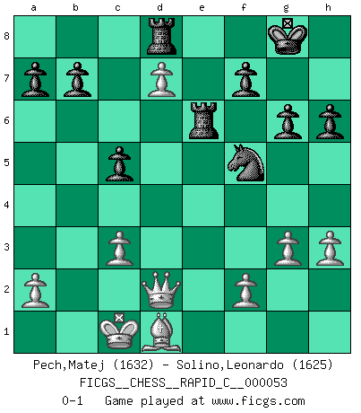 Last move : 0-1 2008 October 20 12:20:9 [Event "FICGS__CHESS__RAPID_C__000053"] [Site "FICGS"] [Date "2008.06.23"] [Round "1"] [White "Pech,Matej"] [Black "Solino,Leonardo"] [Result "0-1"] [WhiteElo "1632"] [BlackElo "1625"] 1.d4 Nf6 2.c4 g6 3.Nc3 Bg7 4.e4 d6 5.Be2 O-O 6.Bg5 c5 7.d5 h6 8.Bf4 e6 9.dxe6 Bxe6 10.Bxd6 Re8 11.Nf3 Qb6 12.Bxb8 Raxb8 13.Qc2 Nh5 14.g3 Bxc3+ 15.bxc3 Bg4 16.h3 Bxf3 17.Bxf3 Qe6 18.O-O-O Qxc4 19.Rhe1 Ng7 20.e5 Qa6 21.Rd6 Qxd6 22.exd6 Rxe1+ 23.Bd1 Rd8 24.Qd2 Re6 25.d7 Nf5 0-1 This chess game has been lost on time (started : 2008.06.23 1:8:51) King's Indian : Averbakh, 6...c5 Kingside Castling by player Black (move 5) Queenside Castling by player White (move 18) Player Black won this chess game. Follow this game move after move (download)After a bad opening, there is hope for the middle game. After a bad middle game, there is hope for the endgame. But once you are in the endgame, the moment of truth has arrived. (Edmar Mednis) Bogoljubow: Matt in vier Zügen! Tartakower: Ich verbitte mir jede Belästigung! (Savielly Grigorievitsch Tartakower) Muchos se han convertido en Maestros de Ajedrez, nadie se ha convertido en el Maestro del Ajedrez. (Siegbert Tarrasch) Votre seul travail dans les ouvertures est d'obtenir un milieu de partie jouable. (Lajos Portish) Creativity is inventing, experimenting, growing, taking risks, breaking rules, making mistakes, and having fun. (Mary Lou Cook)